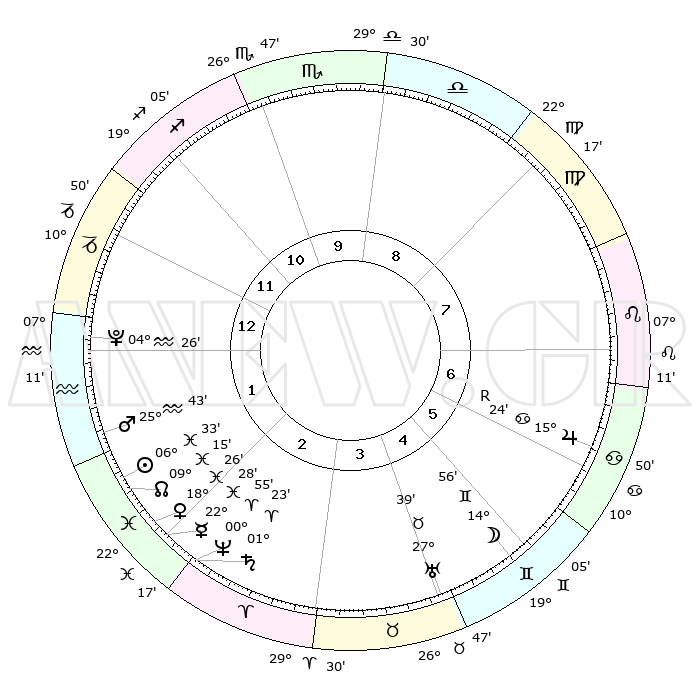 | | ΘΕΣΕΙΣ ΠΛΑΝΗΤΩΝ ΑΣΤΡΟΛΟΓΙΚΟΥ ΧΑΡΤΗ ΤΗΣ ΣΤΙΓΜΗΣ ΑΥΤΗΣ | | | | Πλανήτης | Ζώδιο | Μοίρες | Δεκαήμ. | Σε οίκο | Απόκλιση | | Ακμές των οίκων | | Ηλιος | Ιχθείς | 06°29' | Πρώτο | 2 | 09 S 08 | | 1ος | 12°25' | Αιγόκερως | | Σελήνη | Δίδυμοι | 14°04' | Δεύτερο | 5 | 27 N 42 | | 2ος | 22°44' | Υδροχόος | | Ερμής | Ιχθείς | 22°27' | Τρίτο | 2 | 00 S 41 | | 3ος | 02°58' | Κριός | | Αφροδίτη | Ιχθείς | 18°21' | Δεύτερο | 2 | 05 S 54 | | 4ος | 04°42' | Ταύρος | | Αρης | Υδροχόος | 25°41' | Τρίτο | 2 | 13 S 59 | | 5ος | 29°13' | Ταύρος | | Δίας | Καρκίνος | 15°24'R | Δεύτερο | 7 | 22 N 53 | | 6ος | 20°29' | Δίδυμοι | | Κρόνος | Κριός | 01°23' | Πρώτο | 2 | 01 S 25 | | 7ος | 12°25' | Καρκίνος | | Ουρανός | Ταύρος | 27°39' | Τρίτο | 4 | 19 N 27 | | 8ος | 22°44' | Λέων | | Ποσειδώνας | Κριός | 00°55' | Πρώτο | 2 | 00 S 50 | | 9ος | 02°58' | Ζυγός | | Πλούτωνας | Υδροχόος | 04°26' | Πρώτο | 1 | 22 S 54 | | 10ος | 04°42' | Σκορπιός | | Β. Δεσμός | Ιχθείς | 09°15' | Πρώτο | 2 | 08 S 06 | | 11ος | 29°13' | Σκορπιός | | Ωροσκόπος | Αιγόκερως | 12°25' | Δεύτερο | | | 12ος | 20°29' | Τοξότης | | Μεσουράνημα | Σκορπιός | 04°42' | Πρώτο | | | |