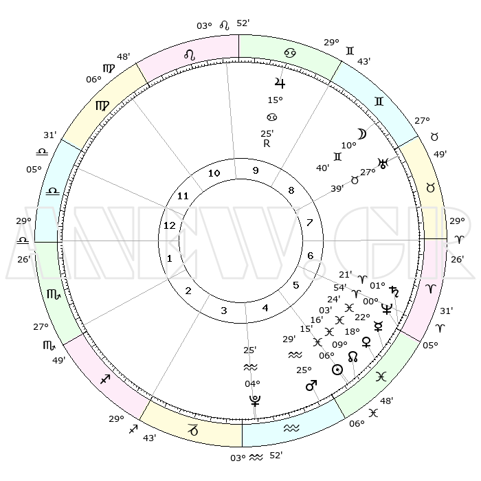 | | ΘΕΣΕΙΣ ΠΛΑΝΗΤΩΝ ΑΣΤΡΟΛΟΓΙΚΟΥ ΧΑΡΤΗ ΤΗΣ ΣΤΙΓΜΗΣ ΑΥΤΗΣ | | | | Πλανήτης | Ζώδιο | Μοίρες | Δεκαήμ. | Σε οίκο | Απόκλιση | | Ακμές των οίκων | | Ηλιος | Ιχθείς | 06°11' | Πρώτο | 5 | 09 S 15 | | 1ος | 09°42' | Ζυγός | | Σελήνη | Δίδυμοι | 09°42' | Πρώτο | 9 | 27 N 07 | | 2ος | 06°56' | Σκορπιός | | Ερμής | Ιχθείς | 22°23' | Τρίτο | 6 | 00 S 46 | | 3ος | 07°45' | Τοξότης | | Αφροδίτη | Ιχθείς | 17°58' | Δεύτερο | 6 | 06 S 03 | | 4ος | 10°55' | Αιγόκερως | | Αρης | Υδροχόος | 25°26' | Τρίτο | 5 | 14 S 04 | | 5ος | 13°51' | Υδροχόος | | Δίας | Καρκίνος | 15°25'R | Δεύτερο | 10 | 22 N 53 | | 6ος | 13°53' | Ιχθείς | | Κρόνος | Κριός | 01°20' | Πρώτο | 6 | 01 S 26 | | 7ος | 09°42' | Κριός | | Ουρανός | Ταύρος | 27°39' | Τρίτο | 8 | 19 N 27 | | 8ος | 06°56' | Ταύρος | | Ποσειδώνας | Κριός | 00°54' | Πρώτο | 6 | 00 S 51 | | 9ος | 07°45' | Δίδυμοι | | Πλούτωνας | Υδροχόος | 04°25' | Πρώτο | 4 | 22 S 54 | | 10ος | 10°55' | Καρκίνος | | Β. Δεσμός | Ιχθείς | 09°16' | Πρώτο | 5 | 08 S 06 | | 11ος | 13°51' | Λέων | | Ωροσκόπος | Ζυγός | 09°42' | Πρώτο | | | 12ος | 13°53' | Παρθένος | | Μεσουράνημα | Καρκίνος | 10°55' | Δεύτερο | | | |