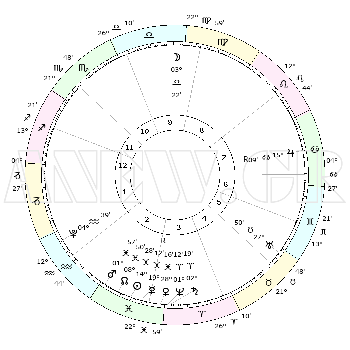 | | ΘΕΣΕΙΣ ΠΛΑΝΗΤΩΝ ΑΣΤΡΟΛΟΓΙΚΟΥ ΧΑΡΤΗ ΤΗΣ ΣΤΙΓΜΗΣ ΑΥΤΗΣ | | | | Πλανήτης | Ζώδιο | Μοίρες | Δεκαήμ. | Σε οίκο | Απόκλιση | | Ακμές των οίκων | | Ηλιος | Ιχθείς | 14°24' | Δεύτερο | 3 | 06 S 09 | | 1ος | 09°23' | Τοξότης | | Σελήνη | Ζυγός | 02°21' | Πρώτο | 10 | 02 S 51 | | 2ος | 12°00' | Αιγόκερως | | Ερμής | Ιχθείς | 19°16'R | Δεύτερο | 3 | 00 S 52 | | 3ος | 19°18' | Υδροχόος | | Αφροδίτη | Ιχθείς | 28°10' | Τρίτο | 4 | 01 S 55 | | 4ος | 25°18' | Ιχθείς | | Αρης | Ιχθείς | 01°53' | Πρώτο | 3 | 11 S 50 | | 5ος | 25°01' | Κριός | | Δίας | Καρκίνος | 15°09'R | Δεύτερο | 8 | 22 N 55 | | 6ος | 18°50' | Ταύρος | | Κρόνος | Κριός | 02°19' | Πρώτο | 4 | 01 S 02 | | 7ος | 09°23' | Δίδυμοι | | Ουρανός | Ταύρος | 27°50' | Τρίτο | 6 | 19 N 30 | | 8ος | 12°00' | Καρκίνος | | Ποσειδώνας | Κριός | 01°12' | Πρώτο | 4 | 00 S 43 | | 9ος | 19°18' | Λέων | | Πλούτωνας | Υδροχόος | 04°38' | Πρώτο | 2 | 22 S 51 | | 10ος | 25°18' | Παρθένος | | Β. Δεσμός | Ιχθείς | 08°50' | Πρώτο | 3 | 08 S 15 | | 11ος | 25°01' | Ζυγός | | Ωροσκόπος | Τοξότης | 09°23' | Πρώτο | | | 12ος | 18°50' | Σκορπιός | | Μεσουράνημα | Παρθένος | 25°18' | Τρίτο | | | |