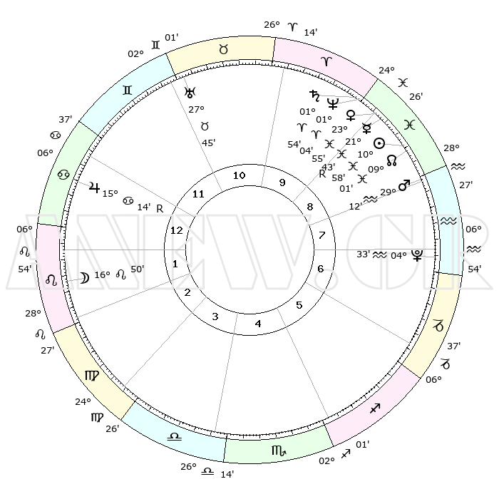 | | ΘΕΣΕΙΣ ΠΛΑΝΗΤΩΝ ΑΣΤΡΟΛΟΓΙΚΟΥ ΧΑΡΤΗ ΤΗΣ ΣΤΙΓΜΗΣ ΑΥΤΗΣ | | | | Πλανήτης | Ζώδιο | Μοίρες | Δεκαήμ. | Σε οίκο | Απόκλιση | | Ακμές των οίκων | | Ηλιος | Ιχθείς | 10°55' | Δεύτερο | 9 | 07 S 28 | | 1ος | 22°02' | Καρκίνος | | Σελήνη | Λέων | 16°08' | Δεύτερο | 2 | 17 N 57 | | 2ος | 12°38' | Λέων | | Ερμής | Ιχθείς | 21°44'R | Τρίτο | 9 | 00 S 10 | | 3ος | 06°38' | Παρθένος | | Αφροδίτη | Ιχθείς | 23°52' | Τρίτο | 9 | 03 S 41 | | 4ος | 06°34' | Ζυγός | | Αρης | Υδροχόος | 29°09' | Τρίτο | 8 | 12 S 47 | | 5ος | 12°37' | Σκορπιός | | Δίας | Καρκίνος | 15°14'R | Δεύτερο | 12 | 22 N 54 | | 6ος | 19°40' | Τοξότης | | Κρόνος | Κριός | 01°54' | Πρώτο | 9 | 01 S 12 | | 7ος | 22°02' | Αιγόκερως | | Ουρανός | Ταύρος | 27°45' | Τρίτο | 11 | 19 N 29 | | 8ος | 12°38' | Υδροχόος | | Ποσειδώνας | Κριός | 01°04' | Πρώτο | 9 | 00 S 47 | | 9ος | 06°38' | Ιχθείς | | Πλούτωνας | Υδροχόος | 04°33' | Πρώτο | 7 | 22 S 52 | | 10ος | 06°34' | Κριός | | Β. Δεσμός | Ιχθείς | 09°01' | Πρώτο | 9 | 08 S 11 | | 11ος | 12°37' | Ταύρος | | Ωροσκόπος | Καρκίνος | 22°02' | Τρίτο | | | 12ος | 19°40' | Δίδυμοι | | Μεσουράνημα | Κριός | 06°34' | Πρώτο | | | |