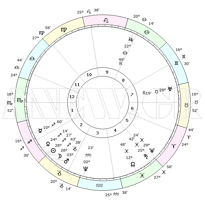 | | ΘΕΣΕΙΣ ΠΛΑΝΗΤΩΝ ΑΣΤΡΟΛΟΓΙΚΟΥ ΧΑΡΤΗ ΤΗΣ ΣΤΙΓΜΗΣ ΑΥΤΗΣ | | | | Πλανήτης | Ζώδιο | Μοίρες | Δεκαήμ. | Σε οίκο | Απόκλιση | | Ακμές των οίκων | | Ηλιος | Τοξότης | 28°22' | Τρίτο | 3 | 23 S 25 | | 1ος | 26°06' | Ζυγός | | Σελήνη | Τοξότης | 27°52' | Τρίτο | 3 | 28 S 14 | | 2ος | 24°17' | Σκορπιός | | Ερμής | Τοξότης | 10°54' | Δεύτερο | 2 | 21 S 11 | | 3ος | 25°57' | Τοξότης | | Αφροδίτη | Τοξότης | 24°09' | Τρίτο | 2 | 23 S 20 | | 4ος | 29°54' | Αιγόκερως | | Αρης | Αιγόκερως | 03°34' | Πρώτο | 3 | 24 S 12 | | 5ος | 02°50' | Ιχθείς | | Δίας | Καρκίνος | 22°49'R | Τρίτο | 9 | 21 N 42 | | 6ος | 01°51' | Κριός | | Κρόνος | Ιχθείς | 25°42' | Τρίτο | 5 | 03 S 49 | | 7ος | 26°06' | Κριός | | Ουρανός | Ταύρος | 28°19'R | Τρίτο | 8 | 19 N 35 | | 8ος | 24°17' | Ταύρος | | Ποσειδώνας | Ιχθείς | 29°24' | Τρίτο | 5 | 01 S 28 | | 9ος | 25°57' | Δίδυμοι | | Πλούτωνας | Υδροχόος | 02°23' | Πρώτο | 4 | 23 S 18 | | 10ος | 29°54' | Καρκίνος | | Β. Δεσμός | Ιχθείς | 12°48' | Δεύτερο | 5 | 06 S 45 | | 11ος | 02°50' | Παρθένος | | Ωροσκόπος | Ζυγός | 26°06' | Τρίτο | | | 12ος | 01°51' | Ζυγός | | Μεσουράνημα | Καρκίνος | 29°54' | Τρίτο | | | |