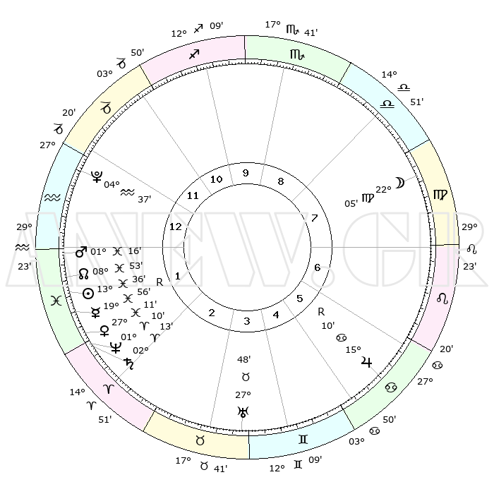 | | ΘΕΣΕΙΣ ΠΛΑΝΗΤΩΝ ΑΣΤΡΟΛΟΓΙΚΟΥ ΧΑΡΤΗ ΤΗΣ ΣΤΙΓΜΗΣ ΑΥΤΗΣ | | | | Πλανήτης | Ζώδιο | Μοίρες | Δεκαήμ. | Σε οίκο | Απόκλιση | | Ακμές των οίκων | | Ηλιος | Ιχθείς | 13°33' | Δεύτερο | 1 | 06 S 28 | | 1ος | 03°38' | Υδροχόος | | Σελήνη | Παρθένος | 21°24' | Τρίτο | 8 | 02 N 22 | | 2ος | 18°17' | Ιχθείς | | Ερμής | Ιχθείς | 19°59'R | Δεύτερο | 2 | 00 S 37 | | 3ος | 26°08' | Κριός | | Αφροδίτη | Ιχθείς | 27°07' | Τρίτο | 2 | 02 S 21 | | 4ος | 23°59' | Ταύρος | | Αρης | Ιχθείς | 01°13' | Πρώτο | 1 | 12 S 04 | | 5ος | 16°30' | Δίδυμοι | | Δίας | Καρκίνος | 15°10'R | Δεύτερο | 6 | 22 N 55 | | 6ος | 08°04' | Καρκίνος | | Κρόνος | Κριός | 02°13' | Πρώτο | 2 | 01 S 04 | | 7ος | 03°38' | Λέων | | Ουρανός | Ταύρος | 27°48' | Τρίτο | 4 | 19 N 29 | | 8ος | 18°17' | Παρθένος | | Ποσειδώνας | Κριός | 01°10' | Πρώτο | 2 | 00 S 44 | | 9ος | 26°08' | Ζυγός | | Πλούτωνας | Υδροχόος | 04°37' | Πρώτο | 1 | 22 S 52 | | 10ος | 23°59' | Σκορπιός | | Β. Δεσμός | Ιχθείς | 08°53' | Πρώτο | 1 | 08 S 14 | | 11ος | 16°30' | Τοξότης | | Ωροσκόπος | Υδροχόος | 03°38' | Πρώτο | | | 12ος | 08°04' | Αιγόκερως | | Μεσουράνημα | Σκορπιός | 23°59' | Τρίτο | | | |
