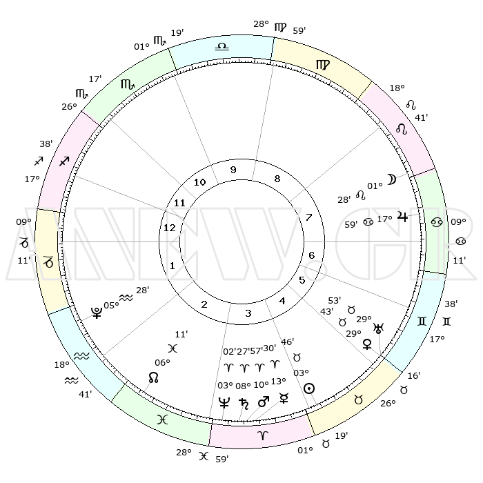 | | ΘΕΣΕΙΣ ΠΛΑΝΗΤΩΝ ΑΣΤΡΟΛΟΓΙΚΟΥ ΧΑΡΤΗ ΤΗΣ ΣΤΙΓΜΗΣ ΑΥΤΗΣ | | | | Πλανήτης | Ζώδιο | Μοίρες | Δεκαήμ. | Σε οίκο | Απόκλιση | | Ακμές των οίκων | | Ηλιος | Ταύρος | 03°42' | Πρώτο | 5 | 12 N 45 | | 1ος | 16°40' | Τοξότης | | Σελήνη | Λέων | 00°31' | Πρώτο | 8 | 23 N 01 | | 2ος | 20°42' | Αιγόκερως | | Ερμής | Κριός | 13°24' | Δεύτερο | 4 | 02 N 59 | | 3ος | 29°10' | Υδροχόος | | Αφροδίτη | Ταύρος | 29°38' | Τρίτο | 6 | 20 N 38 | | 4ος | 04°45' | Κριός | | Αρης | Κριός | 10°54' | Δεύτερο | 4 | 03 N 27 | | 5ος | 03°17' | Ταύρος | | Δίας | Καρκίνος | 17°58' | Δεύτερο | 7 | 22 N 36 | | 6ος | 26°15' | Ταύρος | | Κρόνος | Κριός | 08°26' | Πρώτο | 4 | 01 N 22 | | 7ος | 16°40' | Δίδυμοι | | Ουρανός | Ταύρος | 29°53' | Τρίτο | 6 | 19 N 58 | | 8ος | 20°42' | Καρκίνος | | Ποσειδώνας | Κριός | 03°02' | Πρώτο | 3 | 00 S 00 | | 9ος | 29°10' | Λέων | | Πλούτωνας | Υδροχόος | 05°28' | Πρώτο | 2 | 22 S 48 | | 10ος | 04°45' | Ζυγός | | Β. Δεσμός | Ιχθείς | 06°12' | Πρώτο | 3 | 09 S 14 | | 11ος | 03°17' | Σκορπιός | | Ωροσκόπος | Τοξότης | 16°40' | Δεύτερο | | | 12ος | 26°15' | Σκορπιός | | Μεσουράνημα | Ζυγός | 04°45' | Πρώτο | | | |