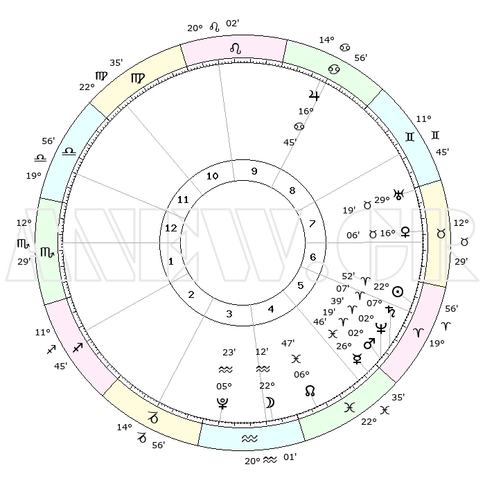 | | ΘΕΣΕΙΣ ΠΛΑΝΗΤΩΝ ΑΣΤΡΟΛΟΓΙΚΟΥ ΧΑΡΤΗ ΤΗΣ ΣΤΙΓΜΗΣ ΑΥΤΗΣ | | | | Πλανήτης | Ζώδιο | Μοίρες | Δεκαήμ. | Σε οίκο | Απόκλιση | | Ακμές των οίκων | | Ηλιος | Κριός | 22°47' | Τρίτο | 7 | 08 N 52 | | 1ος | 20°04' | Ζυγός | | Σελήνη | Υδροχόος | 21°13' | Τρίτο | 4 | 15 S 51 | | 2ος | 17°54' | Σκορπιός | | Ερμής | Ιχθείς | 26°40' | Τρίτο | 6 | 03 S 37 | | 3ος | 19°12' | Τοξότης | | Αφροδίτη | Ταύρος | 16°00' | Δεύτερο | 7 | 16 N 41 | | 4ος | 22°48' | Αιγόκερως | | Αρης | Κριός | 02°15' | Πρώτο | 6 | 00 S 01 | | 5ος | 25°45' | Υδροχόος | | Δίας | Καρκίνος | 16°44' | Δεύτερο | 9 | 22 N 46 | | 6ος | 25°12' | Ιχθείς | | Κρόνος | Κριός | 07°06' | Πρώτο | 6 | 00 N 51 | | 7ος | 20°04' | Κριός | | Ουρανός | Ταύρος | 29°19' | Τρίτο | 8 | 19 N 50 | | 8ος | 17°54' | Ταύρος | | Ποσειδώνας | Κριός | 02°38' | Πρώτο | 6 | 00 S 09 | | 9ος | 19°12' | Δίδυμοι | | Πλούτωνας | Υδροχόος | 05°23' | Πρώτο | 4 | 22 S 47 | | 10ος | 22°48' | Καρκίνος | | Β. Δεσμός | Ιχθείς | 06°47' | Πρώτο | 5 | 09 S 01 | | 11ος | 25°45' | Λέων | | Ωροσκόπος | Ζυγός | 20°04' | Τρίτο | | | 12ος | 25°12' | Παρθένος | | Μεσουράνημα | Καρκίνος | 22°48' | Τρίτο | | | |