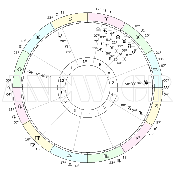 | | ΘΕΣΕΙΣ ΠΛΑΝΗΤΩΝ ΑΣΤΡΟΛΟΓΙΚΟΥ ΧΑΡΤΗ ΤΗΣ ΣΤΙΓΜΗΣ ΑΥΤΗΣ | | | | Πλανήτης | Ζώδιο | Μοίρες | Δεκαήμ. | Σε οίκο | Απόκλιση | | Ακμές των οίκων | | Ηλιος | Ιχθείς | 21°52' | Τρίτο | 9 | 03 S 13 | | 1ος | 12°25' | Καρκίνος | | Σελήνη | Αιγόκερως | 03°18' | Πρώτο | 6 | 28 S 12 | | 2ος | 02°50' | Λέων | | Ερμής | Ιχθείς | 12°05'R | Δεύτερο | 9 | 04 S 17 | | 3ος | 25°42' | Λέων | | Αφροδίτη | Κριός | 07°28' | Πρώτο | 10 | 01 N 56 | | 4ος | 24°04' | Παρθένος | | Αρης | Ιχθείς | 07°46' | Πρώτο | 9 | 09 S 40 | | 5ος | 29°35' | Ζυγός | | Δίας | Καρκίνος | 15°05' | Δεύτερο | 1 | 22 N 56 | | 6ος | 08°11' | Τοξότης | | Κρόνος | Κριός | 03°14' | Πρώτο | 10 | 00 S 40 | | 7ος | 12°25' | Αιγόκερως | | Ουρανός | Ταύρος | 28°02' | Τρίτο | 11 | 19 N 33 | | 8ος | 02°50' | Υδροχόος | | Ποσειδώνας | Κριός | 01°28' | Πρώτο | 10 | 00 S 37 | | 9ος | 25°42' | Υδροχόος | | Πλούτωνας | Υδροχόος | 04°50' | Πρώτο | 8 | 22 S 50 | | 10ος | 24°04' | Ιχθείς | | Β. Δεσμός | Ιχθείς | 08°26' | Πρώτο | 9 | 08 S 24 | | 11ος | 29°35' | Κριός | | Ωροσκόπος | Καρκίνος | 12°25' | Δεύτερο | | | 12ος | 08°11' | Δίδυμοι | | Μεσουράνημα | Ιχθείς | 24°04' | Τρίτο | | | |