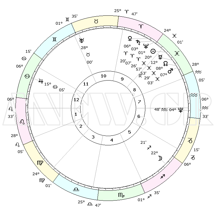 | | ΘΕΣΕΙΣ ΠΛΑΝΗΤΩΝ ΑΣΤΡΟΛΟΓΙΚΟΥ ΧΑΡΤΗ ΤΗΣ ΣΤΙΓΜΗΣ ΑΥΤΗΣ | | | | Πλανήτης | Ζώδιο | Μοίρες | Δεκαήμ. | Σε οίκο | Απόκλιση | | Ακμές των οίκων | | Ηλιος | Ιχθείς | 20°53' | Τρίτο | 9 | 03 S 37 | | 1ος | 16°40' | Καρκίνος | | Σελήνη | Τοξότης | 21°33' | Τρίτο | 6 | 28 S 18 | | 2ος | 07°08' | Λέων | | Ερμής | Ιχθείς | 12°56'R | Δεύτερο | 9 | 03 S 47 | | 3ος | 00°28' | Παρθένος | | Αφροδίτη | Κριός | 06°15' | Πρώτο | 10 | 01 N 26 | | 4ος | 29°33' | Παρθένος | | Αρης | Ιχθείς | 06°60' | Πρώτο | 9 | 09 S 57 | | 5ος | 05°23' | Σκορπιός | | Δίας | Καρκίνος | 15°05' | Δεύτερο | 12 | 22 N 56 | | 6ος | 13°19' | Τοξότης | | Κρόνος | Κριός | 03°06' | Πρώτο | 10 | 00 S 43 | | 7ος | 16°40' | Αιγόκερως | | Ουρανός | Ταύρος | 28°00' | Τρίτο | 11 | 19 N 32 | | 8ος | 07°08' | Υδροχόος | | Ποσειδώνας | Κριός | 01°26' | Πρώτο | 10 | 00 S 38 | | 9ος | 00°28' | Ιχθείς | | Πλούτωνας | Υδροχόος | 04°48' | Πρώτο | 7 | 22 S 50 | | 10ος | 29°33' | Ιχθείς | | Β. Δεσμός | Ιχθείς | 08°29' | Πρώτο | 9 | 08 S 23 | | 11ος | 05°23' | Ταύρος | | Ωροσκόπος | Καρκίνος | 16°40' | Δεύτερο | | | 12ος | 13°19' | Δίδυμοι | | Μεσουράνημα | Ιχθείς | 29°33' | Τρίτο | | | |