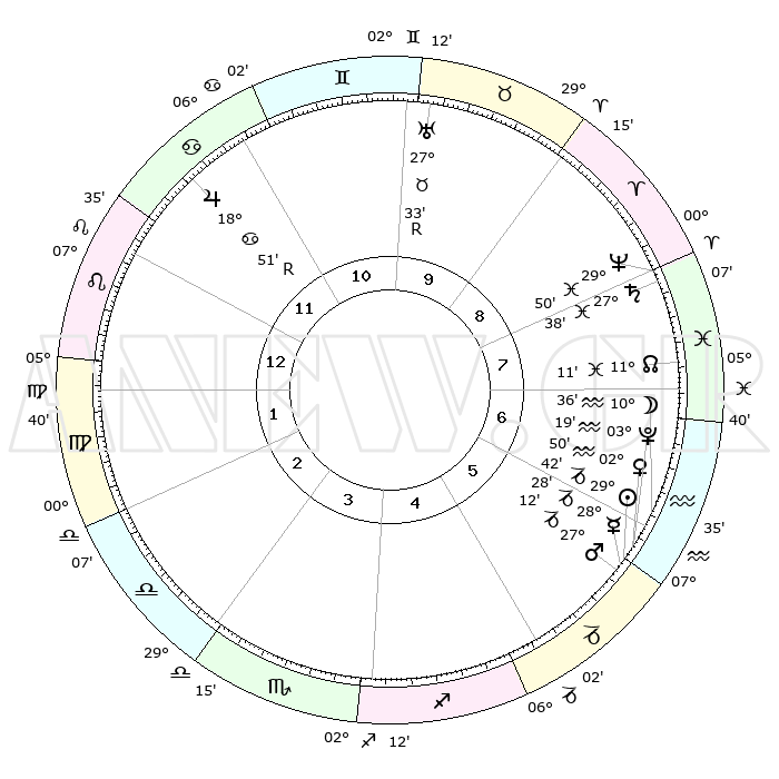 | | ΘΕΣΕΙΣ ΠΛΑΝΗΤΩΝ ΑΣΤΡΟΛΟΓΙΚΟΥ ΧΑΡΤΗ ΤΗΣ ΣΤΙΓΜΗΣ ΑΥΤΗΣ | | | | Πλανήτης | Ζώδιο | Μοίρες | Δεκαήμ. | Σε οίκο | Απόκλιση | | Ακμές των οίκων | | Ηλιος | Αιγόκερως | 29°37' | Τρίτο | 6 | 20 S 13 | | 1ος | 15°06' | Λέων | | Σελήνη | Υδροχόος | 09°42' | Πρώτο | 6 | 20 S 17 | | 2ος | 07°25' | Παρθένος | | Ερμής | Αιγόκερως | 28°21' | Τρίτο | 6 | 22 S 27 | | 3ος | 04°28' | Ζυγός | | Αφροδίτη | Υδροχόος | 02°44' | Πρώτο | 6 | 20 S 37 | | 4ος | 06°53' | Σκορπιός | | Αρης | Αιγόκερως | 27°08' | Τρίτο | 6 | 21 S 42 | | 5ος | 12°09' | Τοξότης | | Δίας | Καρκίνος | 18°51'R | Δεύτερο | 12 | 22 N 23 | | 6ος | 15°38' | Αιγόκερως | | Κρόνος | Ιχθείς | 27°38' | Τρίτο | 8 | 02 S 58 | | 7ος | 15°06' | Υδροχόος | | Ουρανός | Ταύρος | 27°34'R | Τρίτο | 10 | 19 N 25 | | 8ος | 07°25' | Ιχθείς | | Ποσειδώνας | Ιχθείς | 29°50' | Τρίτο | 8 | 01 S 17 | | 9ος | 04°28' | Κριός | | Πλούτωνας | Υδροχόος | 03°18' | Πρώτο | 6 | 23 S 06 | | 10ος | 06°53' | Ταύρος | | Β. Δεσμός | Ιχθείς | 11°11' | Δεύτερο | 8 | 07 S 22 | | 11ος | 12°09' | Δίδυμοι | | Ωροσκόπος | Λέων | 15°06' | Δεύτερο | | | 12ος | 15°38' | Καρκίνος | | Μεσουράνημα | Ταύρος | 06°53' | Πρώτο | | | |