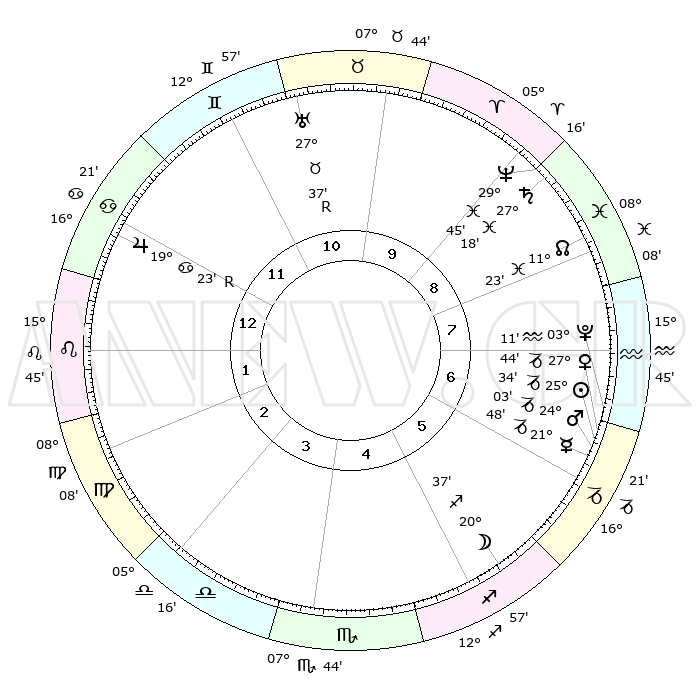 | | ΘΕΣΕΙΣ ΠΛΑΝΗΤΩΝ ΑΣΤΡΟΛΟΓΙΚΟΥ ΧΑΡΤΗ ΤΗΣ ΣΤΙΓΜΗΣ ΑΥΤΗΣ | | | | Πλανήτης | Ζώδιο | Μοίρες | Δεκαήμ. | Σε οίκο | Απόκλιση | | Ακμές των οίκων | | Ηλιος | Αιγόκερως | 25°30' | Τρίτο | 6 | 21 S 02 | | 1ος | 28°24' | Καρκίνος | | Σελήνη | Τοξότης | 19°54' | Δεύτερο | 5 | 28 S 05 | | 2ος | 19°20' | Λέων | | Ερμής | Αιγόκερως | 21°42' | Τρίτο | 6 | 23 S 29 | | 3ος | 14°10' | Παρθένος | | Αφροδίτη | Αιγόκερως | 27°39' | Τρίτο | 6 | 21 S 36 | | 4ος | 15°00' | Ζυγός | | Αρης | Αιγόκερως | 23°60' | Τρίτο | 6 | 22 S 16 | | 5ος | 21°05' | Σκορπιός | | Δίας | Καρκίνος | 19°23'R | Δεύτερο | 12 | 22 N 18 | | 6ος | 27°03' | Τοξότης | | Κρόνος | Ιχθείς | 27°18' | Τρίτο | 9 | 03 S 06 | | 7ος | 28°24' | Αιγόκερως | | Ουρανός | Ταύρος | 27°37'R | Τρίτο | 11 | 19 N 26 | | 8ος | 19°20' | Υδροχόος | | Ποσειδώνας | Ιχθείς | 29°45' | Τρίτο | 9 | 01 S 19 | | 9ος | 14°10' | Ιχθείς | | Πλούτωνας | Υδροχόος | 03°11' | Πρώτο | 7 | 23 S 07 | | 10ος | 15°00' | Κριός | | Β. Δεσμός | Ιχθείς | 11°24' | Δεύτερο | 8 | 07 S 17 | | 11ος | 21°05' | Ταύρος | | Ωροσκόπος | Καρκίνος | 28°24' | Τρίτο | | | 12ος | 27°03' | Δίδυμοι | | Μεσουράνημα | Κριός | 15°00' | Δεύτερο | | | |