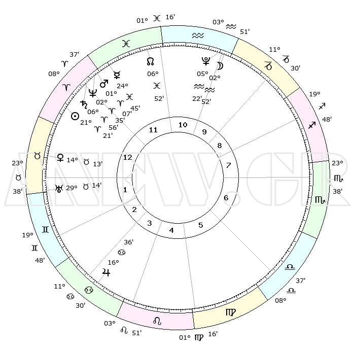 | | ΘΕΣΕΙΣ ΠΛΑΝΗΤΩΝ ΑΣΤΡΟΛΟΓΙΚΟΥ ΧΑΡΤΗ ΤΗΣ ΣΤΙΓΜΗΣ ΑΥΤΗΣ | | | | Πλανήτης | Ζώδιο | Μοίρες | Δεκαήμ. | Σε οίκο | Απόκλιση | | Ακμές των οίκων | | Ηλιος | Κριός | 21°17' | Τρίτο | 1 | 08 N 18 | | 1ος | 14°45' | Κριός | | Σελήνη | Υδροχόος | 01°56' | Πρώτο | 11 | 22 S 42 | | 2ος | 21°12' | Ταύρος | | Ερμής | Ιχθείς | 24°39' | Τρίτο | 12 | 04 S 20 | | 3ος | 16°32' | Δίδυμοι | | Αφροδίτη | Ταύρος | 14°07' | Δεύτερο | 1 | 16 N 04 | | 4ος | 08°21' | Καρκίνος | | Αρης | Κριός | 01°03' | Πρώτο | 12 | 00 S 30 | | 5ος | 01°29' | Λέων | | Δίας | Καρκίνος | 16°35' | Δεύτερο | 4 | 22 N 47 | | 6ος | 01°20' | Παρθένος | | Κρόνος | Κριός | 06°55' | Πρώτο | 12 | 00 N 47 | | 7ος | 14°45' | Ζυγός | | Ουρανός | Ταύρος | 29°14' | Τρίτο | 2 | 19 N 49 | | 8ος | 21°12' | Σκορπιός | | Ποσειδώνας | Κριός | 02°35' | Πρώτο | 12 | 00 S 11 | | 9ος | 16°32' | Τοξότης | | Πλούτωνας | Υδροχόος | 05°22' | Πρώτο | 11 | 22 S 47 | | 10ος | 08°21' | Αιγόκερως | | Β. Δεσμός | Ιχθείς | 06°52' | Πρώτο | 12 | 08 S 59 | | 11ος | 01°29' | Υδροχόος | | Ωροσκόπος | Κριός | 14°45' | Δεύτερο | | | 12ος | 01°20' | Ιχθείς | | Μεσουράνημα | Αιγόκερως | 08°21' | Πρώτο | | | |