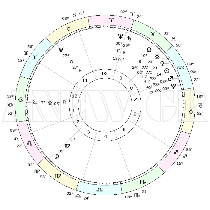 | | ΘΕΣΕΙΣ ΠΛΑΝΗΤΩΝ ΑΣΤΡΟΛΟΓΙΚΟΥ ΧΑΡΤΗ ΤΗΣ ΣΤΙΓΜΗΣ ΑΥΤΗΣ | | | | Πλανήτης | Ζώδιο | Μοίρες | Δεκαήμ. | Σε οίκο | Απόκλιση | | Ακμές των οίκων | | Ηλιος | Υδροχόος | 14°39' | Δεύτερο | 9 | 16 S 26 | | 1ος | 24°30' | Δίδυμοι | | Σελήνη | Παρθένος | 04°49' | Πρώτο | 4 | 10 N 06 | | 2ος | 15°42' | Καρκίνος | | Ερμής | Υδροχόος | 23°54' | Τρίτο | 9 | 15 S 09 | | 3ος | 07°12' | Λέων | | Αφροδίτη | Υδροχόος | 21°19' | Τρίτο | 9 | 15 S 43 | | 4ος | 02°40' | Παρθένος | | Αρης | Υδροχόος | 08°41' | Πρώτο | 9 | 19 S 06 | | 5ος | 05°41' | Ζυγός | | Δίας | Καρκίνος | 17°05'R | Δεύτερο | 2 | 22 N 39 | | 6ος | 15°57' | Σκορπιός | | Κρόνος | Ιχθείς | 29°00' | Τρίτο | 10 | 02 S 23 | | 7ος | 24°30' | Τοξότης | | Ουρανός | Ταύρος | 27°27'R | Τρίτο | 12 | 19 N 24 | | 8ος | 15°42' | Αιγόκερως | | Ποσειδώνας | Κριός | 00°13' | Πρώτο | 10 | 01 S 07 | | 9ος | 07°12' | Υδροχόος | | Πλούτωνας | Υδροχόος | 03°47' | Πρώτο | 8 | 23 S 00 | | 10ος | 02°40' | Ιχθείς | | Β. Δεσμός | Ιχθείς | 10°24' | Δεύτερο | 10 | 07 S 40 | | 11ος | 05°41' | Κριός | | Ωροσκόπος | Δίδυμοι | 24°30' | Τρίτο | | | 12ος | 15°57' | Ταύρος | | Μεσουράνημα | Ιχθείς | 02°40' | Πρώτο | | | |