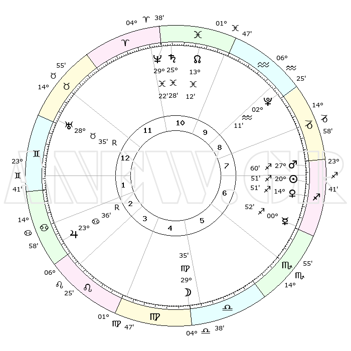 | | ΘΕΣΕΙΣ ΠΛΑΝΗΤΩΝ ΑΣΤΡΟΛΟΓΙΚΟΥ ΧΑΡΤΗ ΤΗΣ ΣΤΙΓΜΗΣ ΑΥΤΗΣ | | | | Πλανήτης | Ζώδιο | Μοίρες | Δεκαήμ. | Σε οίκο | Απόκλιση | | Ακμές των οίκων | | Ηλιος | Τοξότης | 20°46' | Τρίτο | 8 | 23 S 07 | | 1ος | 23°41' | Ταύρος | | Σελήνη | Παρθένος | 28°38' | Τρίτο | 5 | 00 S 42 | | 2ος | 19°51' | Δίδυμοι | | Ερμής | Τοξότης | 00°46' | Πρώτο | 7 | 18 S 31 | | 3ος | 11°32' | Καρκίνος | | Αφροδίτη | Τοξότης | 14°45' | Δεύτερο | 7 | 22 S 18 | | 4ος | 03°53' | Λέων | | Αρης | Τοξότης | 27°56' | Τρίτο | 8 | 24 S 10 | | 5ος | 01°19' | Παρθένος | | Δίας | Καρκίνος | 23°36'R | Τρίτο | 3 | 21 N 33 | | 6ος | 08°41' | Ζυγός | | Κρόνος | Ιχθείς | 25°28' | Τρίτο | 11 | 03 S 56 | | 7ος | 23°41' | Σκορπιός | | Ουρανός | Ταύρος | 28°35'R | Τρίτο | 1 | 19 N 39 | | 8ος | 19°51' | Τοξότης | | Ποσειδώνας | Ιχθείς | 29°22' | Τρίτο | 11 | 01 S 29 | | 9ος | 11°32' | Αιγόκερως | | Πλούτωνας | Υδροχόος | 02°11' | Πρώτο | 9 | 23 S 20 | | 10ος | 03°53' | Υδροχόος | | Β. Δεσμός | Ιχθείς | 13°12' | Δεύτερο | 11 | 06 S 36 | | 11ος | 01°19' | Ιχθείς | | Ωροσκόπος | Ταύρος | 23°41' | Τρίτο | | | 12ος | 08°41' | Κριός | | Μεσουράνημα | Υδροχόος | 03°53' | Πρώτο | | | |