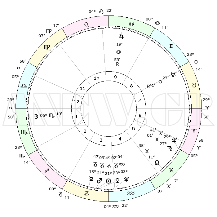 | | ΘΕΣΕΙΣ ΠΛΑΝΗΤΩΝ ΑΣΤΡΟΛΟΓΙΚΟΥ ΧΑΡΤΗ ΤΗΣ ΣΤΙΓΜΗΣ ΑΥΤΗΣ | | | | Πλανήτης | Ζώδιο | Μοίρες | Δεκαήμ. | Σε οίκο | Απόκλιση | | Ακμές των οίκων | | Ηλιος | Αιγόκερως | 21°40' | Τρίτο | 4 | 21 S 41 | | 1ος | 03°09' | Ζυγός | | Σελήνη | Σκορπιός | 05°08' | Πρώτο | 2 | 17 S 11 | | 2ος | 29°57' | Ζυγός | | Ερμής | Αιγόκερως | 15°38' | Δεύτερο | 4 | 24 S 05 | | 3ος | 00°31' | Τοξότης | | Αφροδίτη | Αιγόκερως | 22°55' | Τρίτο | 4 | 22 S 22 | | 4ος | 03°32' | Αιγόκερως | | Αρης | Αιγόκερως | 21°05' | Τρίτο | 4 | 22 S 43 | | 5ος | 06°29' | Υδροχόος | | Δίας | Καρκίνος | 19°54'R | Δεύτερο | 10 | 22 N 13 | | 6ος | 06°48' | Ιχθείς | | Κρόνος | Ιχθείς | 27°00' | Τρίτο | 6 | 03 S 14 | | 7ος | 03°09' | Κριός | | Ουρανός | Ταύρος | 27°41'R | Τρίτο | 8 | 19 N 27 | | 8ος | 29°57' | Κριός | | Ποσειδώνας | Ιχθείς | 29°41' | Τρίτο | 6 | 01 S 21 | | 9ος | 00°31' | Δίδυμοι | | Πλούτωνας | Υδροχόος | 03°04' | Πρώτο | 4 | 23 S 09 | | 10ος | 03°32' | Καρκίνος | | Β. Δεσμός | Ιχθείς | 11°36' | Δεύτερο | 6 | 07 S 13 | | 11ος | 06°29' | Λέων | | Ωροσκόπος | Ζυγός | 03°09' | Πρώτο | | | 12ος | 06°48' | Παρθένος | | Μεσουράνημα | Καρκίνος | 03°32' | Πρώτο | | | |