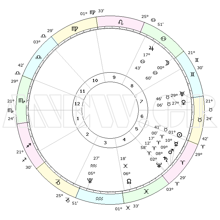 | | ΘΕΣΕΙΣ ΠΛΑΝΗΤΩΝ ΑΣΤΡΟΛΟΓΙΚΟΥ ΧΑΡΤΗ ΤΗΣ ΣΤΙΓΜΗΣ ΑΥΤΗΣ | | | | Πλανήτης | Ζώδιο | Μοίρες | Δεκαήμ. | Σε οίκο | Απόκλιση | | Ακμές των οίκων | | Ηλιος | Ταύρος | 01°36' | Πρώτο | 7 | 12 N 02 | | 1ος | 01°29' | Σκορπιός | | Σελήνη | Δίδυμοι | 29°60' | Τρίτο | 8 | 28 N 09 | | 2ος | 29°59' | Σκορπιός | | Ερμής | Κριός | 09°54' | Πρώτο | 6 | 01 N 33 | | 3ος | 02°04' | Αιγόκερως | | Αφροδίτη | Ταύρος | 27°01' | Τρίτο | 7 | 19 N 57 | | 4ος | 06°22' | Υδροχόος | | Αρης | Κριός | 09°14' | Πρώτο | 6 | 02 N 47 | | 5ος | 09°15' | Ιχθείς | | Δίας | Καρκίνος | 17°43' | Δεύτερο | 9 | 22 N 39 | | 6ος | 07°47' | Κριός | | Κρόνος | Κριός | 08°11' | Πρώτο | 6 | 01 N 16 | | 7ος | 01°29' | Ταύρος | | Ουρανός | Ταύρος | 29°46' | Τρίτο | 7 | 19 N 56 | | 8ος | 29°59' | Ταύρος | | Ποσειδώνας | Κριός | 02°57' | Πρώτο | 5 | 00 S 02 | | 9ος | 02°04' | Καρκίνος | | Πλούτωνας | Υδροχόος | 05°27' | Πρώτο | 3 | 22 S 48 | | 10ος | 06°22' | Λέων | | Β. Δεσμός | Ιχθείς | 06°18' | Πρώτο | 4 | 09 S 12 | | 11ος | 09°15' | Παρθένος | | Ωροσκόπος | Σκορπιός | 01°29' | Πρώτο | | | 12ος | 07°47' | Ζυγός | | Μεσουράνημα | Λέων | 06°22' | Πρώτο | | | |