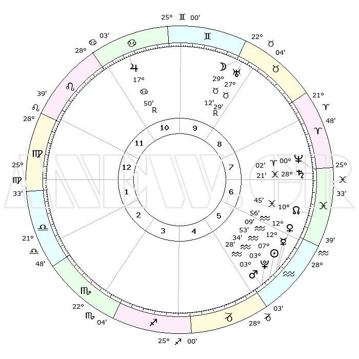 | | ΘΕΣΕΙΣ ΠΛΑΝΗΤΩΝ ΑΣΤΡΟΛΟΓΙΚΟΥ ΧΑΡΤΗ ΤΗΣ ΣΤΙΓΜΗΣ ΑΥΤΗΣ | | | | Πλανήτης | Ζώδιο | Μοίρες | Δεκαήμ. | Σε οίκο | Απόκλιση | | Ακμές των οίκων | | Ηλιος | Υδροχόος | 07°49' | Πρώτο | 6 | 18 S 19 | | 1ος | 05°33' | Παρθένος | | Σελήνη | Ταύρος | 28°14' | Τρίτο | 9 | 24 N 44 | | 2ος | 29°59' | Παρθένος | | Ερμής | Υδροχόος | 12°02' | Δεύτερο | 6 | 19 S 09 | | 3ος | 29°07' | Ζυγός | | Αφροδίτη | Υδροχόος | 12°51' | Δεύτερο | 6 | 18 S 11 | | 4ος | 02°04' | Τοξότης | | Αρης | Υδροχόος | 03°25' | Πρώτο | 5 | 20 S 23 | | 5ος | 05°55' | Αιγόκερως | | Δίας | Καρκίνος | 17°51'R | Δεύτερο | 11 | 22 N 32 | | 6ος | 07°28' | Υδροχόος | | Κρόνος | Ιχθείς | 28°21' | Τρίτο | 7 | 02 S 40 | | 7ος | 05°33' | Ιχθείς | | Ουρανός | Ταύρος | 27°29'R | Τρίτο | 9 | 19 N 24 | | 8ος | 29°59' | Ιχθείς | | Ποσειδώνας | Κριός | 00°02' | Πρώτο | 8 | 01 S 12 | | 9ος | 29°07' | Κριός | | Πλούτωνας | Υδροχόος | 03°34' | Πρώτο | 5 | 23 S 03 | | 10ος | 02°05' | Δίδυμοι | | Β. Δεσμός | Ιχθείς | 10°45' | Δεύτερο | 7 | 07 S 32 | | 11ος | 05°55' | Καρκίνος | | Ωροσκόπος | Παρθένος | 05°33' | Πρώτο | | | 12ος | 07°28' | Λέων | | Μεσουράνημα | Δίδυμοι | 02°05' | Πρώτο | | | |