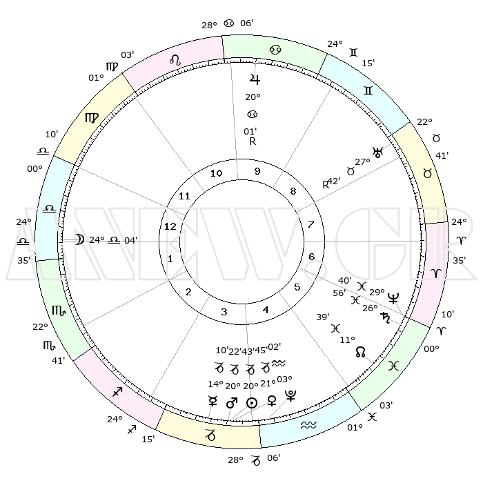 | | ΘΕΣΕΙΣ ΠΛΑΝΗΤΩΝ ΑΣΤΡΟΛΟΓΙΚΟΥ ΧΑΡΤΗ ΤΗΣ ΣΤΙΓΜΗΣ ΑΥΤΗΣ | | | | Πλανήτης | Ζώδιο | Μοίρες | Δεκαήμ. | Σε οίκο | Απόκλιση | | Ακμές των οίκων | | Ηλιος | Αιγόκερως | 20°04' | Τρίτο | 11 | 21 S 56 | | 1ος | 21°16' | Υδροχόος | | Σελήνη | Ζυγός | 16°10' | Δεύτερο | 8 | 09 S 08 | | 2ος | 07°04' | Κριός | | Ερμής | Αιγόκερως | 13°08' | Δεύτερο | 11 | 24 S 14 | | 3ος | 11°32' | Ταύρος | | Αφροδίτη | Αιγόκερως | 20°56' | Τρίτο | 11 | 22 S 38 | | 4ος | 06°53' | Δίδυμοι | | Αρης | Αιγόκερως | 19°52' | Δεύτερο | 11 | 22 S 54 | | 5ος | 28°40' | Δίδυμοι | | Δίας | Καρκίνος | 20°07'R | Τρίτο | 5 | 22 N 11 | | 6ος | 21°25' | Καρκίνος | | Κρόνος | Ιχθείς | 26°54' | Τρίτο | 1 | 03 S 17 | | 7ος | 21°16' | Λέων | | Ουρανός | Ταύρος | 27°43'R | Τρίτο | 3 | 19 N 27 | | 8ος | 07°04' | Ζυγός | | Ποσειδώνας | Ιχθείς | 29°39' | Τρίτο | 1 | 01 S 21 | | 9ος | 11°32' | Σκορπιός | | Πλούτωνας | Υδροχόος | 03°01' | Πρώτο | 12 | 23 S 10 | | 10ος | 06°53' | Τοξότης | | Β. Δεσμός | Ιχθείς | 11°41' | Δεύτερο | 1 | 07 S 11 | | 11ος | 28°40' | Τοξότης | | Ωροσκόπος | Υδροχόος | 21°16' | Τρίτο | | | 12ος | 21°25' | Αιγόκερως | | Μεσουράνημα | Τοξότης | 06°53' | Πρώτο | | | |