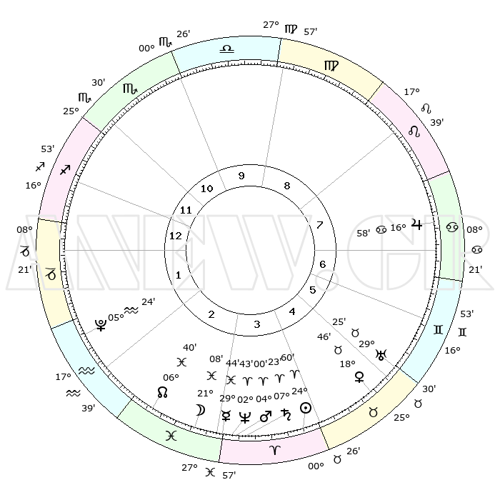 | | ΘΕΣΕΙΣ ΠΛΑΝΗΤΩΝ ΑΣΤΡΟΛΟΓΙΚΟΥ ΧΑΡΤΗ ΤΗΣ ΣΤΙΓΜΗΣ ΑΥΤΗΣ | | | | Πλανήτης | Ζώδιο | Μοίρες | Δεκαήμ. | Σε οίκο | Απόκλιση | | Ακμές των οίκων | | Ηλιος | Κριός | 24°56' | Τρίτο | 4 | 09 N 39 | | 1ος | 18°05' | Τοξότης | | Σελήνη | Ιχθείς | 20°17' | Τρίτο | 3 | 02 S 51 | | 2ος | 22°25' | Αιγόκερως | | Ερμής | Ιχθείς | 29°39' | Τρίτο | 3 | 02 S 31 | | 3ος | 01°05' | Ιχθείς | | Αφροδίτη | Ταύρος | 18°41' | Δεύτερο | 5 | 17 N 32 | | 4ος | 06°33' | Κριός | | Αρης | Κριός | 03°57' | Πρώτο | 3 | 00 N 40 | | 5ος | 04°51' | Ταύρος | | Δίας | Καρκίνος | 16°57' | Δεύτερο | 7 | 22 N 44 | | 6ος | 27°40' | Ταύρος | | Κρόνος | Κριός | 07°22' | Πρώτο | 4 | 00 N 57 | | 7ος | 18°05' | Δίδυμοι | | Ουρανός | Ταύρος | 29°25' | Τρίτο | 6 | 19 N 51 | | 8ος | 22°25' | Καρκίνος | | Ποσειδώνας | Κριός | 02°43' | Πρώτο | 3 | 00 S 07 | | 9ος | 01°05' | Παρθένος | | Πλούτωνας | Υδροχόος | 05°24' | Πρώτο | 2 | 22 S 47 | | 10ος | 06°33' | Ζυγός | | Β. Δεσμός | Ιχθείς | 06°40' | Πρώτο | 3 | 09 S 04 | | 11ος | 04°51' | Σκορπιός | | Ωροσκόπος | Τοξότης | 18°05' | Δεύτερο | | | 12ος | 27°40' | Σκορπιός | | Μεσουράνημα | Ζυγός | 06°33' | Πρώτο | | | |