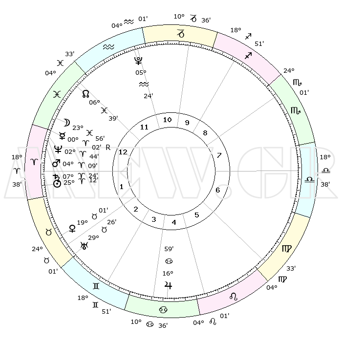 | | ΘΕΣΕΙΣ ΠΛΑΝΗΤΩΝ ΑΣΤΡΟΛΟΓΙΚΟΥ ΧΑΡΤΗ ΤΗΣ ΣΤΙΓΜΗΣ ΑΥΤΗΣ | | | | Πλανήτης | Ζώδιο | Μοίρες | Δεκαήμ. | Σε οίκο | Απόκλιση | | Ακμές των οίκων | | Ηλιος | Κριός | 24°58' | Τρίτο | 4 | 09 N 40 | | 1ος | 28°14' | Τοξότης | | Σελήνη | Ιχθείς | 20°43' | Τρίτο | 3 | 02 S 39 | | 2ος | 04°56' | Υδροχόος | | Ερμής | Ιχθείς | 29°42' | Τρίτο | 3 | 02 S 30 | | 3ος | 14°48' | Ιχθείς | | Αφροδίτη | Ταύρος | 18°44' | Δεύτερο | 5 | 17 N 33 | | 4ος | 19°01' | Κριός | | Αρης | Κριός | 03°59' | Πρώτο | 3 | 00 N 41 | | 5ος | 15°37' | Ταύρος | | Δίας | Καρκίνος | 16°57' | Δεύτερο | 7 | 22 N 44 | | 6ος | 07°32' | Δίδυμοι | | Κρόνος | Κριός | 07°23' | Πρώτο | 3 | 00 N 57 | | 7ος | 28°14' | Δίδυμοι | | Ουρανός | Ταύρος | 29°25' | Τρίτο | 5 | 19 N 51 | | 8ος | 04°56' | Λέων | | Ποσειδώνας | Κριός | 02°43' | Πρώτο | 3 | 00 S 07 | | 9ος | 14°48' | Παρθένος | | Πλούτωνας | Υδροχόος | 05°24' | Πρώτο | 2 | 22 S 47 | | 10ος | 19°01' | Ζυγός | | Β. Δεσμός | Ιχθείς | 06°40' | Πρώτο | 2 | 09 S 04 | | 11ος | 15°37' | Σκορπιός | | Ωροσκόπος | Τοξότης | 28°14' | Τρίτο | | | 12ος | 07°32' | Τοξότης | | Μεσουράνημα | Ζυγός | 19°01' | Δεύτερο | | | |