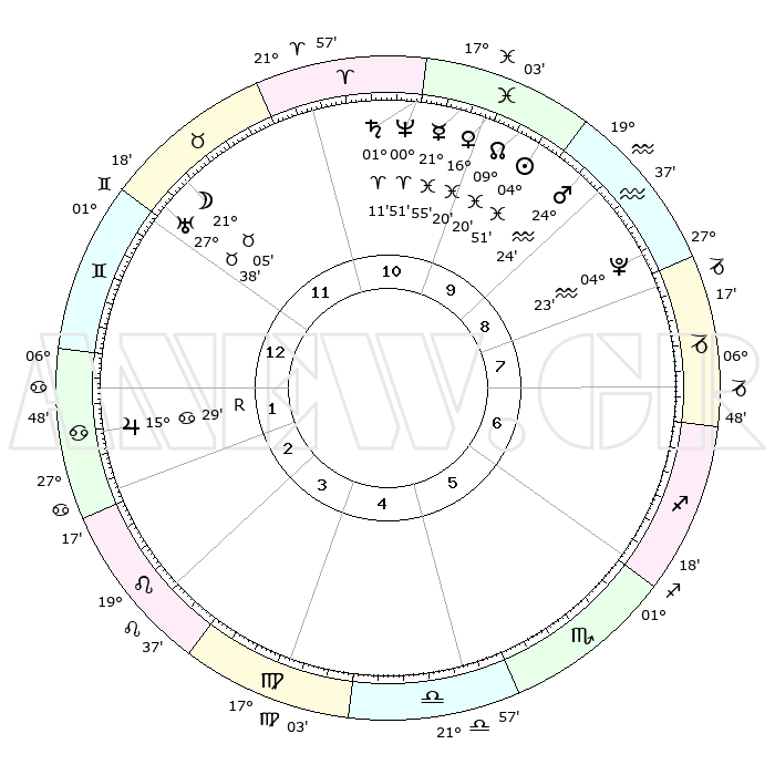 | | ΘΕΣΕΙΣ ΠΛΑΝΗΤΩΝ ΑΣΤΡΟΛΟΓΙΚΟΥ ΧΑΡΤΗ ΤΗΣ ΣΤΙΓΜΗΣ ΑΥΤΗΣ | | | | Πλανήτης | Ζώδιο | Μοίρες | Δεκαήμ. | Σε οίκο | Απόκλιση | | Ακμές των οίκων | | Ηλιος | Ιχθείς | 04°47' | Πρώτο | 10 | 09 S 45 | | 1ος | 13°25' | Δίδυμοι | | Σελήνη | Ταύρος | 20°07' | Τρίτο | 12 | 22 N 35 | | 2ος | 05°54' | Καρκίνος | | Ερμής | Ιχθείς | 21°53' | Τρίτο | 10 | 01 S 16 | | 3ος | 27°06' | Καρκίνος | | Αφροδίτη | Ιχθείς | 16°15' | Δεύτερο | 10 | 06 S 44 | | 4ος | 21°08' | Λέων | | Αρης | Υδροχόος | 24°21' | Τρίτο | 10 | 14 S 26 | | 5ος | 22°03' | Παρθένος | | Δίας | Καρκίνος | 15°29'R | Δεύτερο | 2 | 22 N 52 | | 6ος | 02°04' | Σκορπιός | | Κρόνος | Κριός | 01°11' | Πρώτο | 11 | 01 S 30 | | 7ος | 13°25' | Τοξότης | | Ουρανός | Ταύρος | 27°37' | Τρίτο | 12 | 19 N 27 | | 8ος | 05°54' | Αιγόκερως | | Ποσειδώνας | Κριός | 00°51' | Πρώτο | 11 | 00 S 52 | | 9ος | 27°06' | Αιγόκερως | | Πλούτωνας | Υδροχόος | 04°23' | Πρώτο | 9 | 22 S 54 | | 10ος | 21°08' | Υδροχόος | | Β. Δεσμός | Ιχθείς | 09°20' | Πρώτο | 10 | 08 S 04 | | 11ος | 22°03' | Ιχθείς | | Ωροσκόπος | Δίδυμοι | 13°25' | Δεύτερο | | | 12ος | 02°04' | Ταύρος | | Μεσουράνημα | Υδροχόος | 21°08' | Τρίτο | | | |