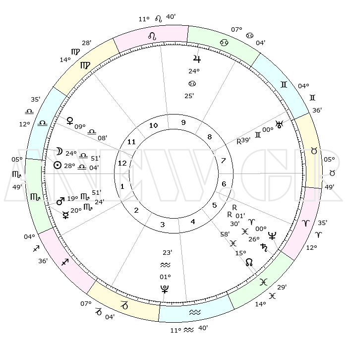 | ΘΕΣΕΙΣ ΠΛΑΝΗΤΩΝ ΑΣΤΡΟΛΟΓΙΚΟΥ ΧΑΡΤΗ ΤΗΣ ΣΤΙΓΜΗΣ ΑΥΤΗΣ | | Πλανήτης | Ζώδιο | Μοίρες | Δεκαήμ. | Σε οίκο | Απόκλιση | | Ακμές των οίκων | Ηλιος | Ζυγός | 27°41' | Τρίτο | 5 | 10 S 39 | | 1ος | 10°51' | Καρκίνος | Σελήνη | Ζυγός | 20°09' | Τρίτο | 4 | 10 S 26 | | 2ος | 01°17' | Λέων | Ερμής | Σκορπιός | 19°54' | Δεύτερο | 5 | 19 S 56 | | 3ος | 23°59' | Λέων | Αφροδίτη | Ζυγός | 08°39' | Πρώτο | 4 | 02 S 01 | | 4ος | 22°06' | Παρθένος | Αρης | Σκορπιός | 19°35' | Δεύτερο | 5 | 17 S 54 | | 5ος | 27°28' | Ζυγός | Δίας | Καρκίνος | 24°23' | Τρίτο | 1 | 21 N 18 | | 6ος | 06°17' | Τοξότης | Κρόνος | Ιχθείς | 26°31'R | Τρίτο | 10 | 03 S 40 | | 7ος | 10°51' | Αιγόκερως | Ουρανός | Δίδυμοι | 00°40'R | Πρώτο | 11 | 20 N 05 | | 8ος | 01°17' | Υδροχόος | Ποσειδώνας | Κριός | 00°02'R | Πρώτο | 10 | 01 S 15 | | 9ος | 23°59' | Υδροχόος | Πλούτωνας | Υδροχόος | 01°23' | Πρώτο | 8 | 23 S 32 | | 10ος | 22°06' | Ιχθείς | Β. Δεσμός | Ιχθείς | 15°59' | Δεύτερο | 9 | 05 S 31 | | 11ος | 27°28' | Κριός | Ωροσκόπος | Καρκίνος | 10°51' | Δεύτερο | | | 12ος | 06°17' | Δίδυμοι | Μεσουράνημα | Ιχθείς | 22°06' | Τρίτο | | | |