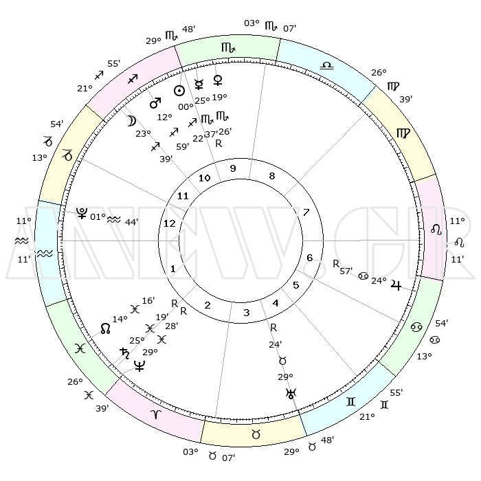 | | ΘΕΣΕΙΣ ΠΛΑΝΗΤΩΝ ΑΣΤΡΟΛΟΓΙΚΟΥ ΧΑΡΤΗ ΤΗΣ ΣΤΙΓΜΗΣ ΑΥΤΗΣ | | | | Πλανήτης | Ζώδιο | Μοίρες | Δεκαήμ. | Σε οίκο | Απόκλιση | | Ακμές των οίκων | | Ηλιος | Τοξότης | 00°18' | Πρώτο | 10 | 20 S 13 | | 1ος | 17°27' | Αιγόκερως | | Σελήνη | Τοξότης | 22°58' | Τρίτο | 11 | 28 S 12 | | 2ος | 28°60' | Υδροχόος | | Ερμής | Σκορπιός | 25°41'R | Τρίτο | 10 | 18 S 02 | | 3ος | 08°57' | Κριός | | Αφροδίτη | Σκορπιός | 19°21' | Δεύτερο | 10 | 16 S 36 | | 4ος | 09°43' | Ταύρος | | Αρης | Τοξότης | 12°56' | Δεύτερο | 11 | 22 S 56 | | 5ος | 03°38' | Δίδυμοι | | Δίας | Καρκίνος | 24°58'R | Τρίτο | 7 | 21 N 16 | | 6ος | 24°51' | Δίδυμοι | | Κρόνος | Ιχθείς | 25°19'R | Τρίτο | 2 | 04 S 04 | | 7ος | 17°27' | Καρκίνος | | Ουρανός | Ταύρος | 29°24'R | Τρίτο | 4 | 19 N 49 | | 8ος | 28°60' | Λέων | | Ποσειδώνας | Ιχθείς | 29°28'R | Τρίτο | 2 | 01 S 28 | | 9ος | 08°57' | Ζυγός | | Πλούτωνας | Υδροχόος | 01°44' | Πρώτο | 1 | 23 S 26 | | 10ος | 09°43' | Σκορπιός | | Β. Δεσμός | Ιχθείς | 14°16' | Δεύτερο | 2 | 06 S 11 | | 11ος | 03°38' | Τοξότης | | Ωροσκόπος | Αιγόκερως | 17°27' | Δεύτερο | | | 12ος | 24°51' | Τοξότης | | Μεσουράνημα | Σκορπιός | 09°43' | Πρώτο | | | |