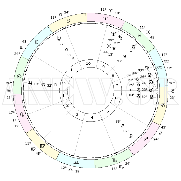 | | ΘΕΣΕΙΣ ΠΛΑΝΗΤΩΝ ΑΣΤΡΟΛΟΓΙΚΟΥ ΧΑΡΤΗ ΤΗΣ ΣΤΙΓΜΗΣ ΑΥΤΗΣ | | | | Πλανήτης | Ζώδιο | Μοίρες | Δεκαήμ. | Σε οίκο | Απόκλιση | | Ακμές των οίκων | | Ηλιος | Αιγόκερως | 24°25' | Τρίτο | 7 | 21 S 14 | | 1ος | 07°50' | Καρκίνος | | Σελήνη | Τοξότης | 07°11' | Πρώτο | 6 | 26 S 33 | | 2ος | 28°18' | Καρκίνος | | Ερμής | Αιγόκερως | 19°59' | Δεύτερο | 7 | 23 S 41 | | 3ος | 20°43' | Λέων | | Αφροδίτη | Αιγόκερως | 26°19' | Τρίτο | 7 | 21 S 50 | | 4ος | 18°19' | Παρθένος | | Αρης | Αιγόκερως | 23°10' | Τρίτο | 7 | 22 S 24 | | 5ος | 23°22' | Ζυγός | | Δίας | Καρκίνος | 19°32'R | Δεύτερο | 1 | 22 N 17 | | 6ος | 02°35' | Τοξότης | | Κρόνος | Ιχθείς | 27°13' | Τρίτο | 10 | 03 S 09 | | 7ος | 07°50' | Αιγόκερως | | Ουρανός | Ταύρος | 27°38'R | Τρίτο | 11 | 19 N 26 | | 8ος | 28°18' | Αιγόκερως | | Ποσειδώνας | Ιχθείς | 29°44' | Τρίτο | 10 | 01 S 19 | | 9ος | 20°43' | Υδροχόος | | Πλούτωνας | Υδροχόος | 03°09' | Πρώτο | 8 | 23 S 08 | | 10ος | 18°19' | Ιχθείς | | Β. Δεσμός | Ιχθείς | 11°27' | Δεύτερο | 9 | 07 S 16 | | 11ος | 23°22' | Κριός | | Ωροσκόπος | Καρκίνος | 07°50' | Πρώτο | | | 12ος | 02°35' | Δίδυμοι | | Μεσουράνημα | Ιχθείς | 18°19' | Δεύτερο | | | |
