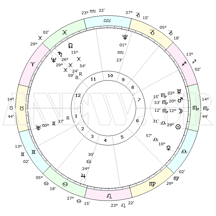 | ΘΕΣΕΙΣ ΠΛΑΝΗΤΩΝ ΑΣΤΡΟΛΟΓΙΚΟΥ ΧΑΡΤΗ ΤΗΣ ΣΤΙΓΜΗΣ ΑΥΤΗΣ | | Πλανήτης | Ζώδιο | Μοίρες | Δεκαήμ. | Σε οίκο | Απόκλιση | | Ακμές των οίκων | Ηλιος | Ζυγός | 29°08' | Τρίτο | 11 | 11 S 10 | | 1ος | 27°45' | Σκορπιός | Σελήνη | Σκορπιός | 07°39' | Πρώτο | 12 | 17 S 47 | | 2ος | 28°34' | Τοξότης | Ερμής | Σκορπιός | 21°46' | Τρίτο | 12 | 20 S 33 | | 3ος | 03°55' | Υδροχόος | Αφροδίτη | Ζυγός | 10°28' | Δεύτερο | 10 | 02 S 44 | | 4ος | 09°54' | Ιχθείς | Αρης | Σκορπιός | 20°37' | Τρίτο | 12 | 18 S 11 | | 5ος | 11°12' | Κριός | Δίας | Καρκίνος | 24°29' | Τρίτο | 8 | 21 N 17 | | 6ος | 06°33' | Ταύρος | Κρόνος | Ιχθείς | 26°26'R | Τρίτο | 4 | 03 S 42 | | 7ος | 27°45' | Ταύρος | Ουρανός | Δίδυμοι | 00°37'R | Πρώτο | 7 | 20 N 04 | | 8ος | 28°35' | Δίδυμοι | Ποσειδώνας | Ιχθείς | 29°60' | Τρίτο | 4 | 01 S 16 | | 9ος | 03°55' | Λέων | Πλούτωνας | Υδροχόος | 01°23' | Πρώτο | 2 | 23 S 32 | | 10ος | 09°54' | Παρθένος | Β. Δεσμός | Ιχθείς | 15°55' | Δεύτερο | 4 | 05 S 33 | | 11ος | 11°12' | Ζυγός | Ωροσκόπος | Σκορπιός | 27°45' | Τρίτο | | | 12ος | 06°33' | Σκορπιός | Μεσουράνημα | Παρθένος | 09°54' | Πρώτο | | | |