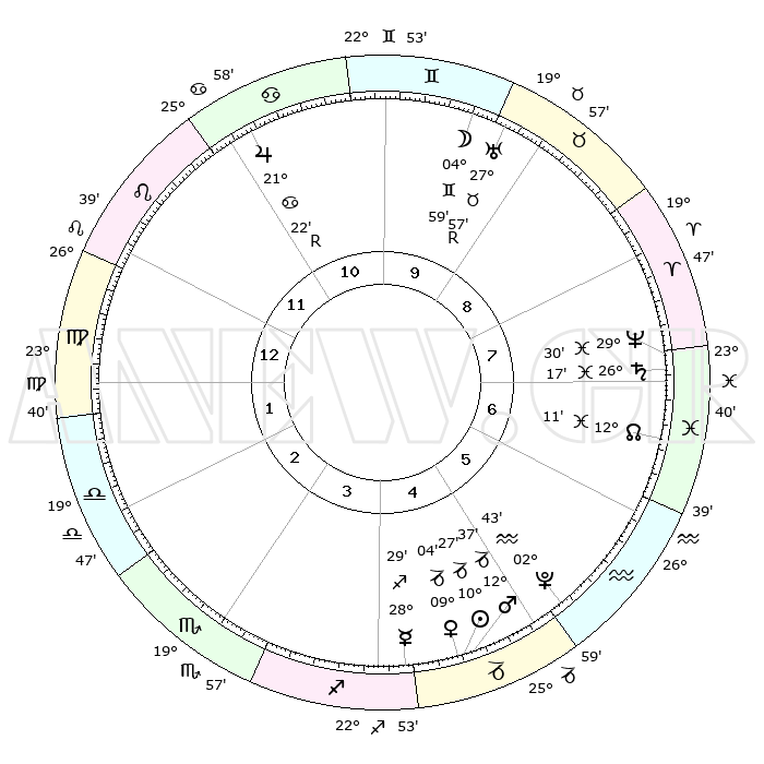 | | ΘΕΣΕΙΣ ΠΛΑΝΗΤΩΝ ΑΣΤΡΟΛΟΓΙΚΟΥ ΧΑΡΤΗ ΤΗΣ ΣΤΙΓΜΗΣ ΑΥΤΗΣ | | | | Πλανήτης | Ζώδιο | Μοίρες | Δεκαήμ. | Σε οίκο | Απόκλιση | | Ακμές των οίκων | | Ηλιος | Αιγόκερως | 10°22' | Δεύτερο | 5 | 23 S 02 | | 1ος | 00°52' | Παρθένος | | Σελήνη | Δίδυμοι | 03°49' | Πρώτο | 10 | 25 N 50 | | 2ος | 24°49' | Παρθένος | | Ερμής | Τοξότης | 28°22' | Τρίτο | 4 | 23 S 58 | | 3ος | 23°34' | Ζυγός | | Αφροδίτη | Αιγόκερως | 08°59' | Πρώτο | 5 | 23 S 38 | | 4ος | 26°29' | Σκορπιός | | Αρης | Αιγόκερως | 12°33' | Δεύτερο | 5 | 23 S 44 | | 5ος | 00°37' | Αιγόκερως | | Δίας | Καρκίνος | 21°23'R | Τρίτο | 11 | 21 N 58 | | 6ος | 02°30' | Υδροχόος | | Κρόνος | Ιχθείς | 26°16' | Τρίτο | 8 | 03 S 33 | | 7ος | 00°52' | Ιχθείς | | Ουρανός | Ταύρος | 27°57'R | Τρίτο | 10 | 19 N 30 | | 8ος | 24°49' | Ιχθείς | | Ποσειδώνας | Ιχθείς | 29°30' | Τρίτο | 8 | 01 S 25 | | 9ος | 23°34' | Κριός | | Πλούτωνας | Υδροχόος | 02°43' | Πρώτο | 6 | 23 S 13 | | 10ος | 26°29' | Ταύρος | | Β. Δεσμός | Ιχθείς | 12°11' | Δεύτερο | 7 | 06 S 59 | | 11ος | 00°37' | Καρκίνος | | Ωροσκόπος | Παρθένος | 00°52' | Πρώτο | | | 12ος | 02°30' | Λέων | | Μεσουράνημα | Ταύρος | 26°29' | Τρίτο | | | |