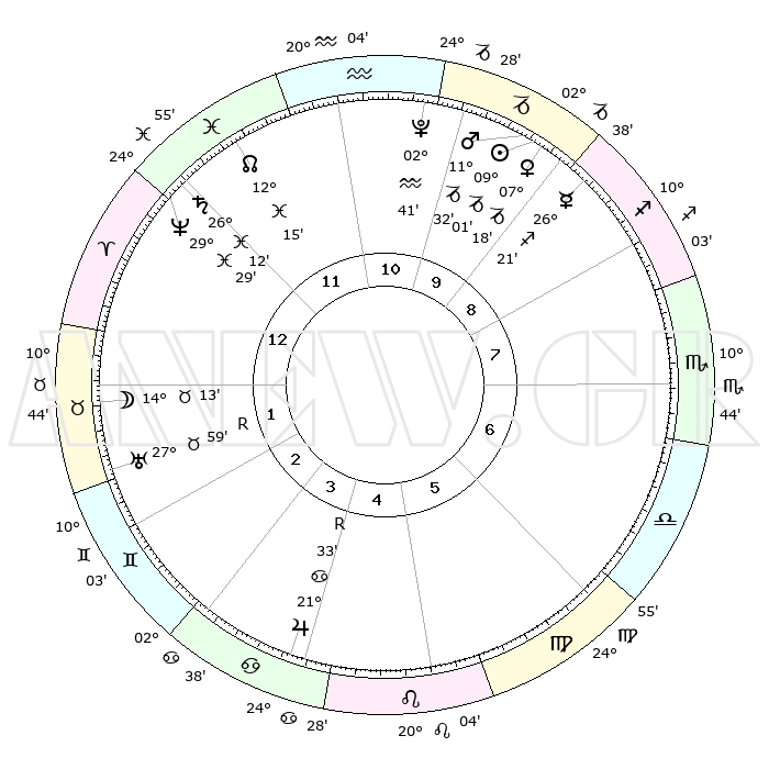 | | ΘΕΣΕΙΣ ΠΛΑΝΗΤΩΝ ΑΣΤΡΟΛΟΓΙΚΟΥ ΧΑΡΤΗ ΤΗΣ ΣΤΙΓΜΗΣ ΑΥΤΗΣ | | | | Πλανήτης | Ζώδιο | Μοίρες | Δεκαήμ. | Σε οίκο | Απόκλιση | | Ακμές των οίκων | | Ηλιος | Αιγόκερως | 08°57' | Πρώτο | 10 | 23 S 08 | | 1ος | 01°44' | Κριός | | Σελήνη | Ταύρος | 13°12' | Δεύτερο | 2 | 20 N 04 | | 2ος | 11°36' | Ταύρος | | Ερμής | Τοξότης | 26°15' | Τρίτο | 9 | 23 S 46 | | 3ος | 08°44' | Δίδυμοι | | Αφροδίτη | Αιγόκερως | 07°13' | Πρώτο | 10 | 23 S 41 | | 4ος | 00°58' | Καρκίνος | | Αρης | Αιγόκερως | 11°29' | Δεύτερο | 10 | 23 S 49 | | 5ος | 23°21' | Καρκίνος | | Δίας | Καρκίνος | 21°34'R | Τρίτο | 4 | 21 N 56 | | 6ος | 21°01' | Λέων | | Κρόνος | Ιχθείς | 26°12' | Τρίτο | 12 | 03 S 35 | | 7ος | 01°44' | Ζυγός | | Ουρανός | Ταύρος | 27°59'R | Τρίτο | 2 | 19 N 31 | | 8ος | 11°36' | Σκορπιός | | Ποσειδώνας | Ιχθείς | 29°29' | Τρίτο | 12 | 01 S 26 | | 9ος | 08°44' | Τοξότης | | Πλούτωνας | Υδροχόος | 02°41' | Πρώτο | 11 | 23 S 14 | | 10ος | 00°58' | Αιγόκερως | | Β. Δεσμός | Ιχθείς | 12°15' | Δεύτερο | 12 | 06 S 58 | | 11ος | 23°21' | Αιγόκερως | | Ωροσκόπος | Κριός | 01°44' | Πρώτο | | | 12ος | 21°01' | Υδροχόος | | Μεσουράνημα | Αιγόκερως | 00°58' | Πρώτο | | | |