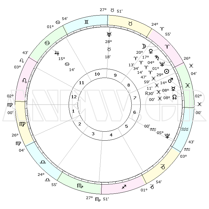 | | ΘΕΣΕΙΣ ΠΛΑΝΗΤΩΝ ΑΣΤΡΟΛΟΓΙΚΟΥ ΧΑΡΤΗ ΤΗΣ ΣΤΙΓΜΗΣ ΑΥΤΗΣ | | | | Πλανήτης | Ζώδιο | Μοίρες | Δεκαήμ. | Σε οίκο | Απόκλιση | | Ακμές των οίκων | | Ηλιος | Ιχθείς | 29°55' | Τρίτο | 9 | 00 S 02 | | 1ος | 10°40' | Λέων | | Σελήνη | Κριός | 19°09' | Δεύτερο | 9 | 10 N 38 | | 2ος | 02°33' | Παρθένος | | Ερμής | Ιχθείς | 08°30'R | Πρώτο | 8 | 07 S 24 | | 3ος | 29°02' | Παρθένος | | Αφροδίτη | Κριός | 17°29' | Δεύτερο | 9 | 06 N 03 | | 4ος | 01°09' | Σκορπιός | | Αρης | Ιχθείς | 14°07' | Δεύτερο | 8 | 07 S 14 | | 5ος | 06°43' | Τοξότης | | Δίας | Καρκίνος | 15°14' | Δεύτερο | 12 | 22 N 55 | | 6ος | 10°47' | Αιγόκερως | | Κρόνος | Κριός | 04°14' | Πρώτο | 9 | 00 S 16 | | 7ος | 10°40' | Υδροχόος | | Ουρανός | Ταύρος | 28°18' | Τρίτο | 10 | 19 N 36 | | 8ος | 02°33' | Ιχθείς | | Ποσειδώνας | Κριός | 01°47' | Πρώτο | 9 | 00 S 30 | | 9ος | 29°02' | Ιχθείς | | Πλούτωνας | Υδροχόος | 05°00' | Πρώτο | 6 | 22 S 49 | | 10ος | 01°09' | Ταύρος | | Β. Δεσμός | Ιχθείς | 08°01' | Πρώτο | 8 | 08 S 34 | | 11ος | 06°43' | Δίδυμοι | | Ωροσκόπος | Λέων | 10°40' | Δεύτερο | | | 12ος | 10°47' | Καρκίνος | | Μεσουράνημα | Ταύρος | 01°09' | Πρώτο | | | |