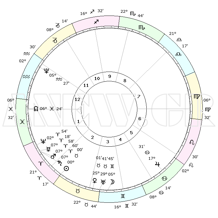 | | ΘΕΣΕΙΣ ΠΛΑΝΗΤΩΝ ΑΣΤΡΟΛΟΓΙΚΟΥ ΧΑΡΤΗ ΤΗΣ ΣΤΙΓΜΗΣ ΑΥΤΗΣ | | | | Πλανήτης | Ζώδιο | Μοίρες | Δεκαήμ. | Σε οίκο | Απόκλιση | | Ακμές των οίκων | | Ηλιος | Κριός | 29°57' | Τρίτο | 3 | 11 N 27 | | 1ος | 05°06' | Υδροχόος | | Σελήνη | Δίδυμοι | 04°49' | Πρώτο | 4 | 26 N 06 | | 2ος | 19°57' | Ιχθείς | | Ερμής | Κριός | 07°12' | Πρώτο | 2 | 00 N 27 | | 3ος | 27°32' | Κριός | | Αφροδίτη | Ταύρος | 24°56' | Τρίτο | 3 | 19 N 23 | | 4ος | 25°09' | Ταύρος | | Αρης | Κριός | 07°55' | Πρώτο | 2 | 02 N 16 | | 5ος | 17°35' | Δίδυμοι | | Δίας | Καρκίνος | 17°31' | Δεύτερο | 6 | 22 N 40 | | 6ος | 09°13' | Καρκίνος | | Κρόνος | Κριός | 07°59' | Πρώτο | 2 | 01 N 11 | | 7ος | 05°06' | Λέων | | Ουρανός | Ταύρος | 29°41' | Τρίτο | 4 | 19 N 55 | | 8ος | 19°57' | Παρθένος | | Ποσειδώνας | Κριός | 02°54' | Πρώτο | 2 | 00 S 03 | | 9ος | 27°32' | Ζυγός | | Πλούτωνας | Υδροχόος | 05°27' | Πρώτο | 1 | 22 S 48 | | 10ος | 25°09' | Σκορπιός | | Β. Δεσμός | Ιχθείς | 06°24' | Πρώτο | 1 | 09 S 10 | | 11ος | 17°35' | Τοξότης | | Ωροσκόπος | Υδροχόος | 05°06' | Πρώτο | | | 12ος | 09°13' | Αιγόκερως | | Μεσουράνημα | Σκορπιός | 25°09' | Τρίτο | | | |