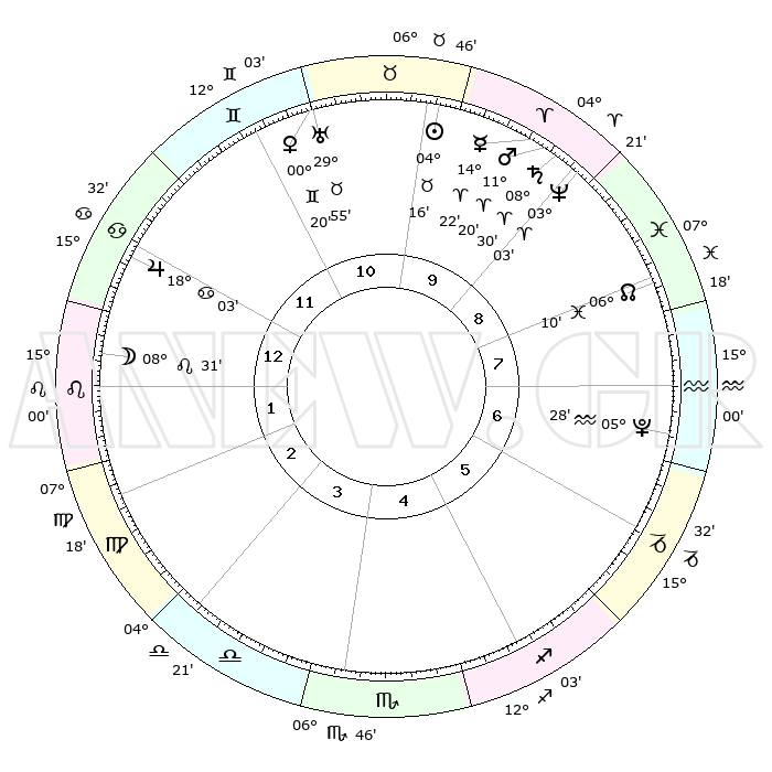 | | ΘΕΣΕΙΣ ΠΛΑΝΗΤΩΝ ΑΣΤΡΟΛΟΓΙΚΟΥ ΧΑΡΤΗ ΤΗΣ ΣΤΙΓΜΗΣ ΑΥΤΗΣ | | | | Πλανήτης | Ζώδιο | Μοίρες | Δεκαήμ. | Σε οίκο | Απόκλιση | | Ακμές των οίκων | | Ηλιος | Ταύρος | 04°13' | Πρώτο | 10 | 12 N 55 | | 1ος | 27°02' | Καρκίνος | | Σελήνη | Λέων | 07°40' | Πρώτο | 1 | 20 N 47 | | 2ος | 17°53' | Λέων | | Ερμής | Κριός | 14°16' | Δεύτερο | 10 | 03 N 21 | | 3ος | 12°32' | Παρθένος | | Αφροδίτη | Δίδυμοι | 00°16' | Πρώτο | 11 | 20 N 47 | | 4ος | 13°11' | Ζυγός | | Αρης | Κριός | 11°18' | Δεύτερο | 9 | 03 N 37 | | 5ος | 19°16' | Σκορπιός | | Δίας | Καρκίνος | 18°02' | Δεύτερο | 12 | 22 N 36 | | 6ος | 25°28' | Τοξότης | | Κρόνος | Κριός | 08°30' | Πρώτο | 9 | 01 N 23 | | 7ος | 27°02' | Αιγόκερως | | Ουρανός | Ταύρος | 29°55' | Τρίτο | 11 | 19 N 58 | | 8ος | 17°53' | Υδροχόος | | Ποσειδώνας | Κριός | 03°03' | Πρώτο | 9 | 00 N 00 | | 9ος | 12°32' | Ιχθείς | | Πλούτωνας | Υδροχόος | 05°28' | Πρώτο | 7 | 22 S 48 | | 10ος | 13°11' | Κριός | | Β. Δεσμός | Ιχθείς | 06°10' | Πρώτο | 8 | 09 S 15 | | 11ος | 19°16' | Ταύρος | | Ωροσκόπος | Καρκίνος | 27°02' | Τρίτο | | | 12ος | 25°28' | Δίδυμοι | | Μεσουράνημα | Κριός | 13°11' | Δεύτερο | | | |
