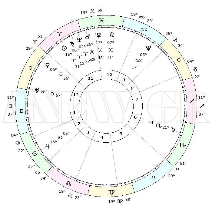| | ΘΕΣΕΙΣ ΠΛΑΝΗΤΩΝ ΑΣΤΡΟΛΟΓΙΚΟΥ ΧΑΡΤΗ ΤΗΣ ΣΤΙΓΜΗΣ ΑΥΤΗΣ | | | | Πλανήτης | Ζώδιο | Μοίρες | Δεκαήμ. | Σε οίκο | Απόκλιση | | Ακμές των οίκων | | Ηλιος | Κριός | 15°15' | Δεύτερο | 2 | 06 N 00 | | 1ος | 26°12' | Αιγόκερως | | Σελήνη | Σκορπιός | 18°30' | Δεύτερο | 10 | 22 S 00 | | 2ος | 09°37' | Ιχθείς | | Ερμής | Ιχθείς | 17°31' | Δεύτερο | 2 | 06 S 39 | | 3ος | 18°37' | Κριός | | Αφροδίτη | Ταύρος | 06°36' | Πρώτο | 3 | 13 N 27 | | 4ος | 17°45' | Ταύρος | | Αρης | Ιχθείς | 26°16' | Τρίτο | 2 | 02 S 26 | | 5ος | 10°49' | Δίδυμοι | | Δίας | Καρκίνος | 16°04' | Δεύτερο | 6 | 22 N 50 | | 6ος | 02°07' | Καρκίνος | | Κρόνος | Κριός | 06°10' | Πρώτο | 2 | 00 N 29 | | 7ος | 26°12' | Καρκίνος | | Ουρανός | Ταύρος | 28°57' | Τρίτο | 4 | 19 N 45 | | 8ος | 09°37' | Παρθένος | | Ποσειδώνας | Κριός | 02°22' | Πρώτο | 2 | 00 S 16 | | 9ος | 18°37' | Ζυγός | | Πλούτωνας | Υδροχόος | 05°17' | Πρώτο | 1 | 22 S 47 | | 10ος | 17°45' | Σκορπιός | | Β. Δεσμός | Ιχθείς | 07°11' | Πρώτο | 1 | 08 S 52 | | 11ος | 10°49' | Τοξότης | | Ωροσκόπος | Αιγόκερως | 26°12' | Τρίτο | | | 12ος | 02°07' | Αιγόκερως | | Μεσουράνημα | Σκορπιός | 17°45' | Δεύτερο | | | |