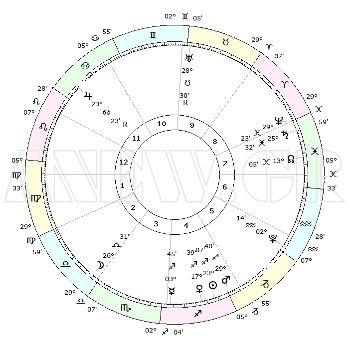 | | ΘΕΣΕΙΣ ΠΛΑΝΗΤΩΝ ΑΣΤΡΟΛΟΓΙΚΟΥ ΧΑΡΤΗ ΤΗΣ ΣΤΙΓΜΗΣ ΑΥΤΗΣ | | | | Πλανήτης | Ζώδιο | Μοίρες | Δεκαήμ. | Σε οίκο | Απόκλιση | | Ακμές των οίκων | | Ηλιος | Τοξότης | 22°47' | Τρίτο | 8 | 23 S 14 | | 1ος | 17°52' | Ταύρος | | Σελήνη | Ζυγός | 22°37' | Τρίτο | 6 | 11 S 46 | | 2ος | 15°23' | Δίδυμοι | | Ερμής | Τοξότης | 03°19' | Πρώτο | 7 | 19 S 15 | | 3ος | 07°26' | Καρκίνος | | Αφροδίτη | Τοξότης | 17°15' | Δεύτερο | 8 | 22 S 38 | | 4ος | 29°30' | Καρκίνος | | Αρης | Τοξότης | 29°26' | Τρίτο | 8 | 24 S 12 | | 5ος | 26°03' | Λέων | | Δίας | Καρκίνος | 23°25'R | Τρίτο | 3 | 21 N 36 | | 6ος | 02°20' | Ζυγός | | Κρόνος | Ιχθείς | 25°31' | Τρίτο | 11 | 03 S 55 | | 7ος | 17°52' | Σκορπιός | | Ουρανός | Ταύρος | 28°31'R | Τρίτο | 1 | 19 N 38 | | 8ος | 15°23' | Τοξότης | | Ποσειδώνας | Ιχθείς | 29°23' | Τρίτο | 11 | 01 S 29 | | 9ος | 07°26' | Αιγόκερως | | Πλούτωνας | Υδροχόος | 02°14' | Πρώτο | 10 | 23 S 20 | | 10ος | 29°30' | Αιγόκερως | | Β. Δεσμός | Ιχθείς | 13°06' | Δεύτερο | 11 | 06 S 38 | | 11ος | 26°03' | Υδροχόος | | Ωροσκόπος | Ταύρος | 17°52' | Δεύτερο | | | 12ος | 02°20' | Κριός | | Μεσουράνημα | Αιγόκερως | 29°30' | Τρίτο | | | |