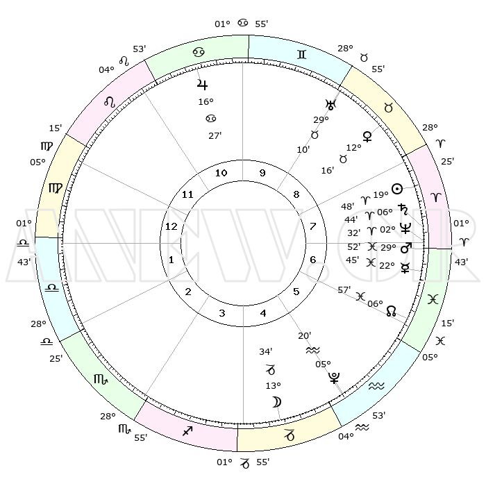 | | ΘΕΣΕΙΣ ΠΛΑΝΗΤΩΝ ΑΣΤΡΟΛΟΓΙΚΟΥ ΧΑΡΤΗ ΤΗΣ ΣΤΙΓΜΗΣ ΑΥΤΗΣ | | | | Πλανήτης | Ζώδιο | Μοίρες | Δεκαήμ. | Σε οίκο | Απόκλιση | | Ακμές των οίκων | | Ηλιος | Κριός | 19°44' | Δεύτερο | 8 | 07 N 43 | | 1ος | 15°08' | Παρθένος | | Σελήνη | Αιγόκερως | 12°54' | Δεύτερο | 4 | 27 S 02 | | 2ος | 10°30' | Ζυγός | | Ερμής | Ιχθείς | 22°41' | Τρίτο | 7 | 05 S 01 | | 3ος | 10°16' | Σκορπιός | | Αφροδίτη | Ταύρος | 12°12' | Δεύτερο | 9 | 15 N 25 | | 4ος | 13°12' | Τοξότης | | Αρης | Ιχθείς | 29°50' | Τρίτο | 7 | 01 S 00 | | 5ος | 16°34' | Αιγόκερως | | Δίας | Καρκίνος | 16°27' | Δεύτερο | 10 | 22 N 48 | | 6ος | 17°36' | Υδροχόος | | Κρόνος | Κριός | 06°43' | Πρώτο | 7 | 00 N 42 | | 7ος | 15°08' | Ιχθείς | | Ουρανός | Ταύρος | 29°09' | Τρίτο | 9 | 19 N 48 | | 8ος | 10°30' | Κριός | | Ποσειδώνας | Κριός | 02°32' | Πρώτο | 7 | 00 S 12 | | 9ος | 10°16' | Ταύρος | | Πλούτωνας | Υδροχόος | 05°20' | Πρώτο | 5 | 22 S 47 | | 10ος | 13°12' | Δίδυμοι | | Β. Δεσμός | Ιχθείς | 06°57' | Πρώτο | 6 | 08 S 57 | | 11ος | 16°34' | Καρκίνος | | Ωροσκόπος | Παρθένος | 15°08' | Δεύτερο | | | 12ος | 17°36' | Λέων | | Μεσουράνημα | Δίδυμοι | 13°12' | Δεύτερο | | | |
