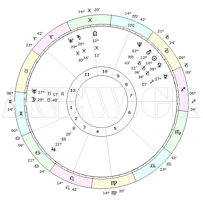 | | ΘΕΣΕΙΣ ΠΛΑΝΗΤΩΝ ΑΣΤΡΟΛΟΓΙΚΟΥ ΧΑΡΤΗ ΤΗΣ ΣΤΙΓΜΗΣ ΑΥΤΗΣ | | | | Πλανήτης | Ζώδιο | Μοίρες | Δεκαήμ. | Σε οίκο | Απόκλιση | | Ακμές των οίκων | | Ηλιος | Αιγόκερως | 10°01' | Δεύτερο | 9 | 23 S 03 | | 1ος | 01°44' | Ταύρος | | Σελήνη | Ταύρος | 28°42' | Τρίτο | 1 | 24 N 41 | | 2ος | 03°28' | Δίδυμοι | | Ερμής | Τοξότης | 27°51' | Τρίτο | 9 | 23 S 56 | | 3ος | 26°51' | Δίδυμοι | | Αφροδίτη | Αιγόκερως | 08°33' | Πρώτο | 9 | 23 S 39 | | 4ος | 18°33' | Καρκίνος | | Αρης | Αιγόκερως | 12°17' | Δεύτερο | 9 | 23 S 45 | | 5ος | 13°08' | Λέων | | Δίας | Καρκίνος | 21°25'R | Τρίτο | 4 | 21 N 58 | | 6ος | 16°11' | Παρθένος | | Κρόνος | Ιχθείς | 26°15' | Τρίτο | 12 | 03 S 34 | | 7ος | 01°44' | Σκορπιός | | Ουρανός | Ταύρος | 27°58'R | Τρίτο | 1 | 19 N 30 | | 8ος | 03°28' | Τοξότης | | Ποσειδώνας | Ιχθείς | 29°30' | Τρίτο | 12 | 01 S 25 | | 9ος | 26°51' | Τοξότης | | Πλούτωνας | Υδροχόος | 02°42' | Πρώτο | 10 | 23 S 13 | | 10ος | 18°33' | Αιγόκερως | | Β. Δεσμός | Ιχθείς | 12°12' | Δεύτερο | 11 | 06 S 59 | | 11ος | 13°08' | Υδροχόος | | Ωροσκόπος | Ταύρος | 01°44' | Πρώτο | | | 12ος | 16°11' | Ιχθείς | | Μεσουράνημα | Αιγόκερως | 18°33' | Δεύτερο | | | |