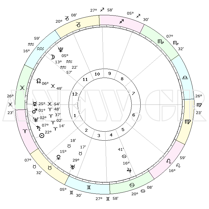 | | ΘΕΣΕΙΣ ΠΛΑΝΗΤΩΝ ΑΣΤΡΟΛΟΓΙΚΟΥ ΧΑΡΤΗ ΤΗΣ ΣΤΙΓΜΗΣ ΑΥΤΗΣ | | | | Πλανήτης | Ζώδιο | Μοίρες | Δεκαήμ. | Σε οίκο | Απόκλιση | | Ακμές των οίκων | | Ηλιος | Κριός | 22°10' | Τρίτο | 2 | 08 N 38 | | 1ος | 18°22' | Υδροχόος | | Σελήνη | Υδροχόος | 13°05' | Δεύτερο | 12 | 18 S 59 | | 2ος | 04°10' | Κριός | | Ερμής | Ιχθείς | 25°49' | Τρίτο | 1 | 03 S 56 | | 3ος | 09°13' | Ταύρος | | Αφροδίτη | Ταύρος | 15°13' | Δεύτερο | 3 | 16 N 26 | | 4ος | 04°55' | Δίδυμοι | | Αρης | Κριός | 01°45' | Πρώτο | 1 | 00 S 13 | | 5ος | 26°47' | Δίδυμοι | | Δίας | Καρκίνος | 16°40' | Δεύτερο | 5 | 22 N 46 | | 6ος | 19°17' | Καρκίνος | | Κρόνος | Κριός | 07°02' | Πρώτο | 2 | 00 N 49 | | 7ος | 18°22' | Λέων | | Ουρανός | Ταύρος | 29°17' | Τρίτο | 3 | 19 N 50 | | 8ος | 04°10' | Ζυγός | | Ποσειδώνας | Κριός | 02°37' | Πρώτο | 1 | 00 S 10 | | 9ος | 09°13' | Σκορπιός | | Πλούτωνας | Υδροχόος | 05°22' | Πρώτο | 12 | 22 S 47 | | 10ος | 04°55' | Τοξότης | | Β. Δεσμός | Ιχθείς | 06°49' | Πρώτο | 1 | 09 S 00 | | 11ος | 26°47' | Τοξότης | | Ωροσκόπος | Υδροχόος | 18°22' | Δεύτερο | | | 12ος | 19°17' | Αιγόκερως | | Μεσουράνημα | Τοξότης | 04°55' | Πρώτο | | | |