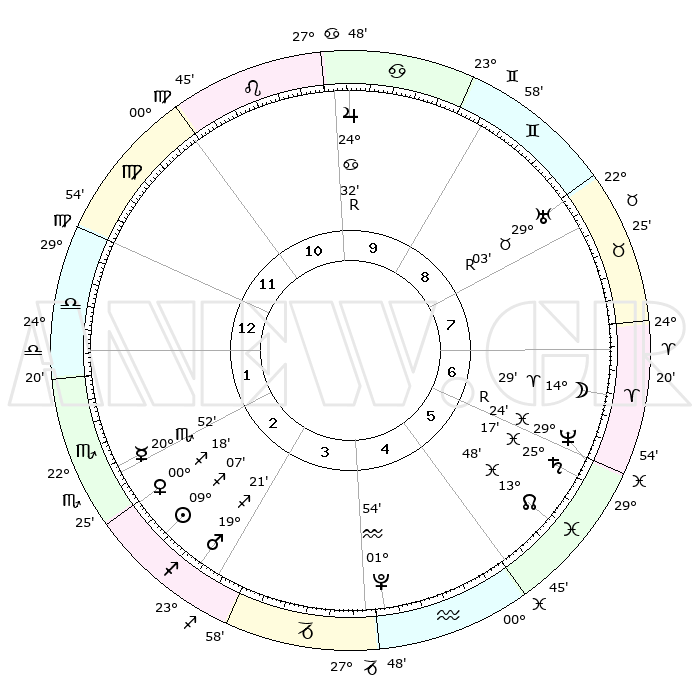 | | ΘΕΣΕΙΣ ΠΛΑΝΗΤΩΝ ΑΣΤΡΟΛΟΓΙΚΟΥ ΧΑΡΤΗ ΤΗΣ ΣΤΙΓΜΗΣ ΑΥΤΗΣ | | | | Πλανήτης | Ζώδιο | Μοίρες | Δεκαήμ. | Σε οίκο | Απόκλιση | | Ακμές των οίκων | | Ηλιος | Τοξότης | 09°04' | Πρώτο | 2 | 21 S 48 | | 1ος | 12°32' | Ζυγός | | Σελήνη | Κριός | 13°54' | Δεύτερο | 7 | 07 N 47 | | 2ος | 09°56' | Σκορπιός | | Ερμής | Σκορπιός | 20°51' | Τρίτο | 2 | 15 S 27 | | 3ος | 10°52' | Τοξότης | | Αφροδίτη | Τοξότης | 00°15' | Πρώτο | 2 | 19 S 31 | | 4ος | 14°08' | Αιγόκερως | | Αρης | Τοξότης | 19°20' | Δεύτερο | 3 | 23 S 40 | | 5ος | 17°04' | Υδροχόος | | Δίας | Καρκίνος | 24°32'R | Τρίτο | 10 | 21 N 22 | | 6ος | 16°57' | Ιχθείς | | Κρόνος | Ιχθείς | 25°17' | Τρίτο | 6 | 04 S 03 | | 7ος | 12°32' | Κριός | | Ουρανός | Ταύρος | 29°03'R | Τρίτο | 8 | 19 N 44 | | 8ος | 09°56' | Ταύρος | | Ποσειδώνας | Ιχθείς | 29°24'R | Τρίτο | 6 | 01 S 29 | | 9ος | 10°52' | Δίδυμοι | | Πλούτωνας | Υδροχόος | 01°54' | Πρώτο | 4 | 23 S 24 | | 10ος | 14°08' | Καρκίνος | | Β. Δεσμός | Ιχθείς | 13°49' | Δεύτερο | 5 | 06 S 22 | | 11ος | 17°04' | Λέων | | Ωροσκόπος | Ζυγός | 12°32' | Δεύτερο | | | 12ος | 16°57' | Παρθένος | | Μεσουράνημα | Καρκίνος | 14°08' | Δεύτερο | | | |