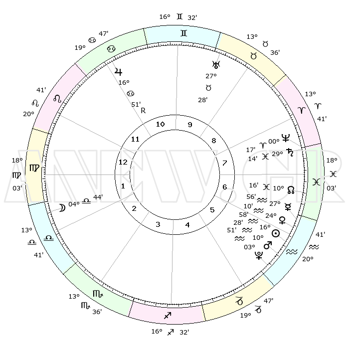 | | ΘΕΣΕΙΣ ΠΛΑΝΗΤΩΝ ΑΣΤΡΟΛΟΓΙΚΟΥ ΧΑΡΤΗ ΤΗΣ ΣΤΙΓΜΗΣ ΑΥΤΗΣ | | | | Πλανήτης | Ζώδιο | Μοίρες | Δεκαήμ. | Σε οίκο | Απόκλιση | | Ακμές των οίκων | | Ηλιος | Υδροχόος | 16°53' | Δεύτερο | 6 | 15 S 46 | | 1ος | 25°44' | Λέων | | Σελήνη | Ζυγός | 03°45' | Πρώτο | 2 | 03 S 30 | | 2ος | 19°08' | Παρθένος | | Ερμής | Υδροχόος | 27°48' | Τρίτο | 7 | 13 S 38 | | 3ος | 17°24' | Ζυγός | | Αφροδίτη | Υδροχόος | 24°04' | Τρίτο | 6 | 14 S 50 | | 4ος | 20°14' | Σκορπιός | | Αρης | Υδροχόος | 10°25' | Δεύτερο | 6 | 18 S 39 | | 5ος | 24°44' | Τοξότης | | Δίας | Καρκίνος | 16°51'R | Δεύτερο | 11 | 22 N 41 | | 6ος | 27°03' | Αιγόκερως | | Κρόνος | Ιχθείς | 29°14' | Τρίτο | 8 | 02 S 18 | | 7ος | 25°44' | Υδροχόος | | Ουρανός | Ταύρος | 27°27' | Τρίτο | 10 | 19 N 24 | | 8ος | 19°08' | Ιχθείς | | Ποσειδώνας | Κριός | 00°17' | Πρώτο | 8 | 01 S 06 | | 9ος | 17°24' | Κριός | | Πλούτωνας | Υδροχόος | 03°51' | Πρώτο | 6 | 23 S 00 | | 10ος | 20°14' | Ταύρος | | Β. Δεσμός | Ιχθείς | 10°17' | Δεύτερο | 7 | 07 S 43 | | 11ος | 24°44' | Δίδυμοι | | Ωροσκόπος | Λέων | 25°44' | Τρίτο | | | 12ος | 27°03' | Καρκίνος | | Μεσουράνημα | Ταύρος | 20°14' | Τρίτο | | | |