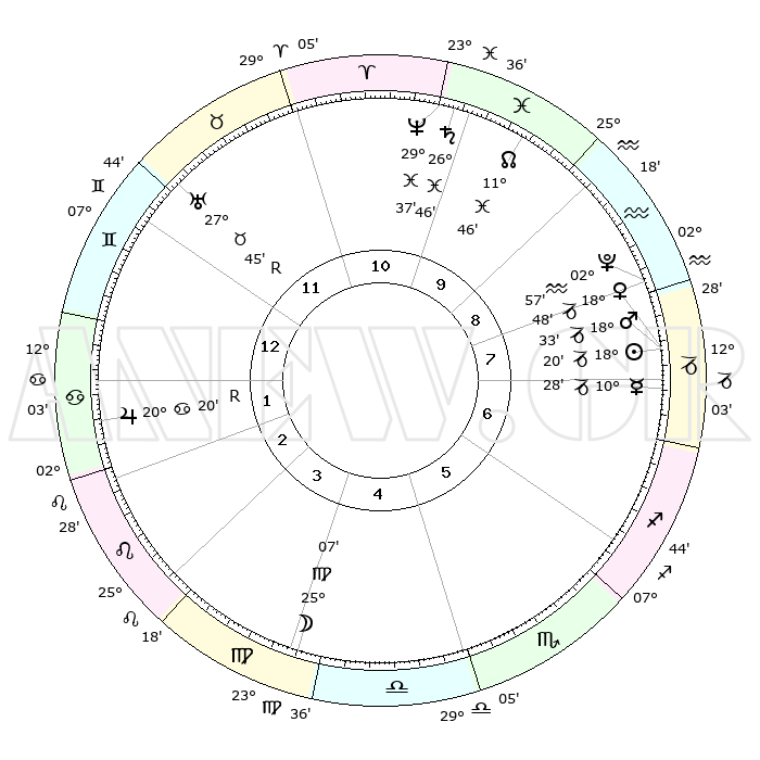 | | ΘΕΣΕΙΣ ΠΛΑΝΗΤΩΝ ΑΣΤΡΟΛΟΓΙΚΟΥ ΧΑΡΤΗ ΤΗΣ ΣΤΙΓΜΗΣ ΑΥΤΗΣ | | | | Πλανήτης | Ζώδιο | Μοίρες | Δεκαήμ. | Σε οίκο | Απόκλιση | | Ακμές των οίκων | | Ηλιος | Αιγόκερως | 16°52' | Δεύτερο | 1 | 22 S 22 | | 1ος | 23°54' | Τοξότης | | Σελήνη | Παρθένος | 06°18' | Πρώτο | 8 | 09 N 32 | | 2ος | 29°33' | Αιγόκερως | | Ερμής | Αιγόκερως | 08°12' | Πρώτο | 1 | 24 S 22 | | 3ος | 08°59' | Ιχθείς | | Αφροδίτη | Αιγόκερως | 16°59' | Δεύτερο | 1 | 23 S 05 | | 4ος | 13°48' | Κριός | | Αρης | Αιγόκερως | 17°26' | Δεύτερο | 1 | 23 S 13 | | 5ος | 11°07' | Ταύρος | | Δίας | Καρκίνος | 20°32'R | Τρίτο | 7 | 22 N 07 | | 6ος | 03°23' | Δίδυμοι | | Κρόνος | Ιχθείς | 26°40' | Τρίτο | 3 | 03 S 23 | | 7ος | 23°54' | Δίδυμοι | | Ουρανός | Ταύρος | 27°47'R | Τρίτο | 5 | 19 N 28 | | 8ος | 29°33' | Καρκίνος | | Ποσειδώνας | Ιχθείς | 29°36' | Τρίτο | 3 | 01 S 23 | | 9ος | 08°59' | Παρθένος | | Πλούτωνας | Υδροχόος | 02°55' | Πρώτο | 2 | 23 S 11 | | 10ος | 13°48' | Ζυγός | | Β. Δεσμός | Ιχθείς | 11°51' | Δεύτερο | 3 | 07 S 07 | | 11ος | 11°07' | Σκορπιός | | Ωροσκόπος | Τοξότης | 23°54' | Τρίτο | | | 12ος | 03°23' | Τοξότης | | Μεσουράνημα | Ζυγός | 13°48' | Δεύτερο | | | |