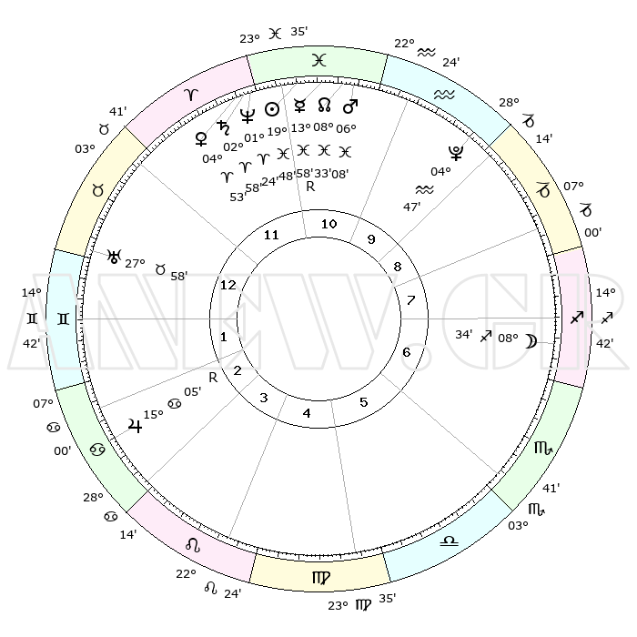 | | ΘΕΣΕΙΣ ΠΛΑΝΗΤΩΝ ΑΣΤΡΟΛΟΓΙΚΟΥ ΧΑΡΤΗ ΤΗΣ ΣΤΙΓΜΗΣ ΑΥΤΗΣ | | | | Πλανήτης | Ζώδιο | Μοίρες | Δεκαήμ. | Σε οίκο | Απόκλιση | | Ακμές των οίκων | | Ηλιος | Ιχθείς | 19°44' | Δεύτερο | 11 | 04 S 04 | | 1ος | 17°35' | Ταύρος | | Σελήνη | Τοξότης | 07°48' | Πρώτο | 7 | 26 S 48 | | 2ος | 15°11' | Δίδυμοι | | Ερμής | Ιχθείς | 14°02'R | Δεύτερο | 11 | 03 S 12 | | 3ος | 07°14' | Καρκίνος | | Αφροδίτη | Κριός | 04°48' | Πρώτο | 12 | 00 N 50 | | 4ος | 29°18' | Καρκίνος | | Αρης | Ιχθείς | 06°05' | Πρώτο | 11 | 10 S 18 | | 5ος | 25°48' | Λέων | | Δίας | Καρκίνος | 15°05'R | Δεύτερο | 3 | 22 N 56 | | 6ος | 02°02' | Ζυγός | | Κρόνος | Κριός | 02°58' | Πρώτο | 12 | 00 S 46 | | 7ος | 17°35' | Σκορπιός | | Ουρανός | Ταύρος | 27°58' | Τρίτο | 1 | 19 N 32 | | 8ος | 15°11' | Τοξότης | | Ποσειδώνας | Κριός | 01°23' | Πρώτο | 11 | 00 S 39 | | 9ος | 07°14' | Αιγόκερως | | Πλούτωνας | Υδροχόος | 04°46' | Πρώτο | 10 | 22 S 50 | | 10ος | 29°18' | Αιγόκερως | | Β. Δεσμός | Ιχθείς | 08°33' | Πρώτο | 11 | 08 S 22 | | 11ος | 25°48' | Υδροχόος | | Ωροσκόπος | Ταύρος | 17°35' | Δεύτερο | | | 12ος | 02°02' | Κριός | | Μεσουράνημα | Αιγόκερως | 29°18' | Τρίτο | | | |