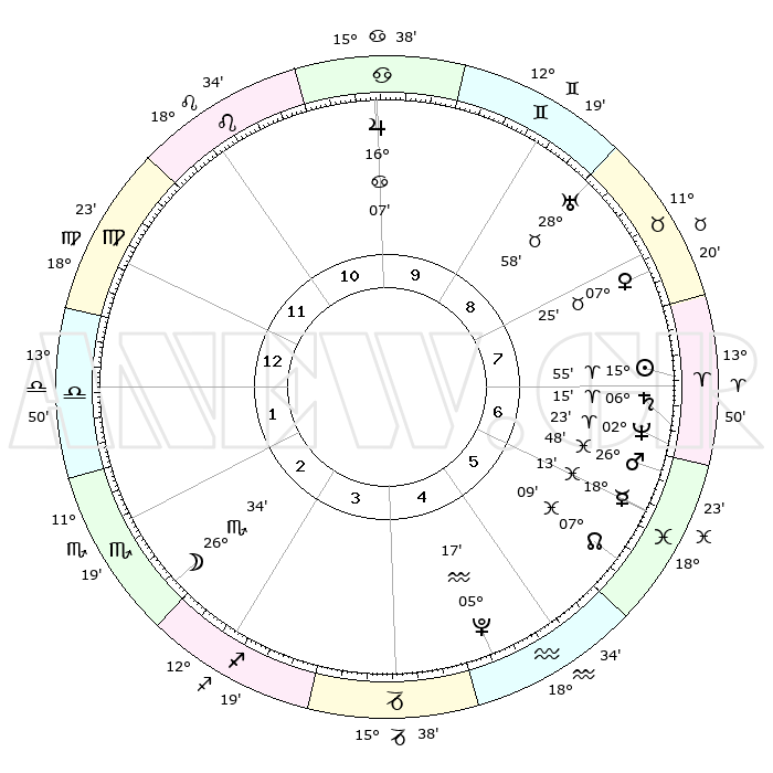 | | ΘΕΣΕΙΣ ΠΛΑΝΗΤΩΝ ΑΣΤΡΟΛΟΓΙΚΟΥ ΧΑΡΤΗ ΤΗΣ ΣΤΙΓΜΗΣ ΑΥΤΗΣ | | | | Πλανήτης | Ζώδιο | Μοίρες | Δεκαήμ. | Σε οίκο | Απόκλιση | | Ακμές των οίκων | | Ηλιος | Κριός | 15°47' | Δεύτερο | 8 | 06 N 12 | | 1ος | 04°37' | Παρθένος | | Σελήνη | Σκορπιός | 24°58' | Τρίτο | 3 | 23 S 52 | | 2ος | 28°57' | Παρθένος | | Ερμής | Ιχθείς | 18°05' | Δεύτερο | 7 | 06 S 29 | | 3ος | 28°01' | Ζυγός | | Αφροδίτη | Ταύρος | 07°16' | Πρώτο | 9 | 13 N 42 | | 4ος | 00°58' | Τοξότης | | Αρης | Ιχθείς | 26°41' | Τρίτο | 7 | 02 S 15 | | 5ος | 04°51' | Αιγόκερως | | Δίας | Καρκίνος | 16°06' | Δεύτερο | 11 | 22 N 50 | | 6ος | 06°29' | Υδροχόος | | Κρόνος | Κριός | 06°14' | Πρώτο | 8 | 00 N 31 | | 7ος | 04°37' | Ιχθείς | | Ουρανός | Ταύρος | 28°58' | Τρίτο | 9 | 19 N 45 | | 8ος | 28°57' | Ιχθείς | | Ποσειδώνας | Κριός | 02°23' | Πρώτο | 8 | 00 S 15 | | 9ος | 28°01' | Κριός | | Πλούτωνας | Υδροχόος | 05°17' | Πρώτο | 5 | 22 S 47 | | 10ος | 00°58' | Δίδυμοι | | Β. Δεσμός | Ιχθείς | 07°10' | Πρώτο | 7 | 08 S 53 | | 11ος | 04°51' | Καρκίνος | | Ωροσκόπος | Παρθένος | 04°37' | Πρώτο | | | 12ος | 06°28' | Λέων | | Μεσουράνημα | Δίδυμοι | 00°58' | Πρώτο | | | |