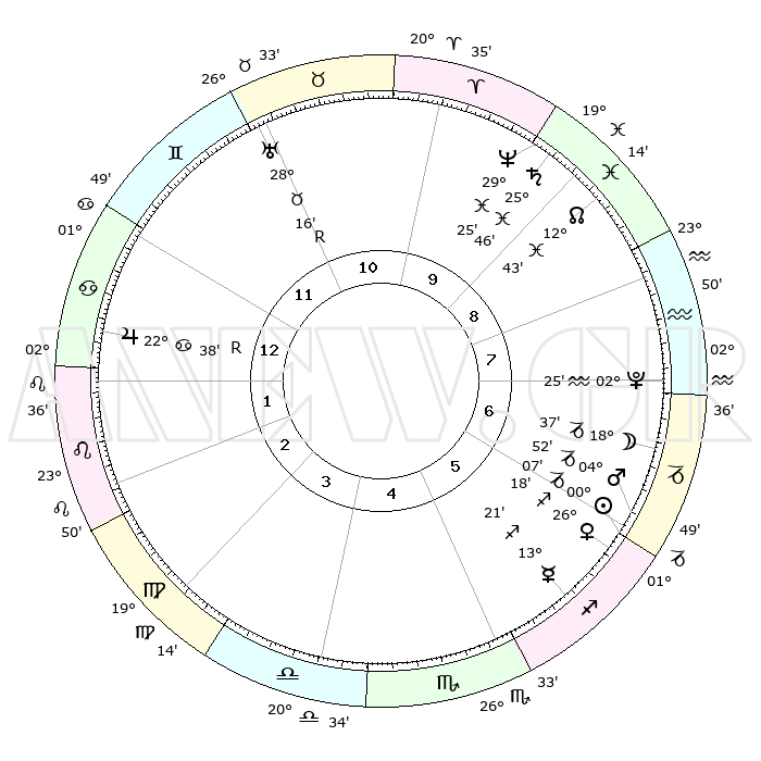 | | ΘΕΣΕΙΣ ΠΛΑΝΗΤΩΝ ΑΣΤΡΟΛΟΓΙΚΟΥ ΧΑΡΤΗ ΤΗΣ ΣΤΙΓΜΗΣ ΑΥΤΗΣ | | | | Πλανήτης | Ζώδιο | Μοίρες | Δεκαήμ. | Σε οίκο | Απόκλιση | | Ακμές των οίκων | | Ηλιος | Αιγόκερως | 00°02' | Πρώτο | 6 | 23 S 26 | | 1ος | 11°01' | Καρκίνος | | Σελήνη | Αιγόκερως | 17°44' | Δεύτερο | 7 | 26 S 17 | | 2ος | 01°26' | Λέων | | Ερμής | Τοξότης | 13°15' | Δεύτερο | 6 | 21 S 42 | | 3ος | 24°10' | Λέων | | Αφροδίτη | Τοξότης | 26°12' | Τρίτο | 6 | 23 S 29 | | 4ος | 22°18' | Παρθένος | | Αρης | Αιγόκερως | 04°49' | Πρώτο | 6 | 24 S 10 | | 5ος | 27°41' | Ζυγός | | Δίας | Καρκίνος | 22°38'R | Τρίτο | 1 | 21 N 45 | | 6ος | 06°29' | Τοξότης | | Κρόνος | Ιχθείς | 25°46' | Τρίτο | 10 | 03 S 47 | | 7ος | 11°01' | Αιγόκερως | | Ουρανός | Ταύρος | 28°16'R | Τρίτο | 11 | 19 N 34 | | 8ος | 01°26' | Υδροχόος | | Ποσειδώνας | Ιχθείς | 29°25' | Τρίτο | 10 | 01 S 28 | | 9ος | 24°10' | Υδροχόος | | Πλούτωνας | Υδροχόος | 02°25' | Πρώτο | 8 | 23 S 17 | | 10ος | 22°18' | Ιχθείς | | Β. Δεσμός | Ιχθείς | 12°43' | Δεύτερο | 9 | 06 S 47 | | 11ος | 27°41' | Κριός | | Ωροσκόπος | Καρκίνος | 11°01' | Δεύτερο | | | 12ος | 06°29' | Δίδυμοι | | Μεσουράνημα | Ιχθείς | 22°18' | Τρίτο | | | |