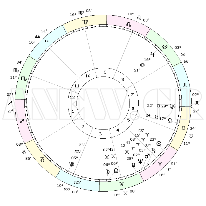 | | ΘΕΣΕΙΣ ΠΛΑΝΗΤΩΝ ΑΣΤΡΟΛΟΓΙΚΟΥ ΧΑΡΤΗ ΤΗΣ ΣΤΙΓΜΗΣ ΑΥΤΗΣ | | | | Πλανήτης | Ζώδιο | Μοίρες | Δεκαήμ. | Σε οίκο | Απόκλιση | | Ακμές των οίκων | | Ηλιος | Κριός | 23°51' | Τρίτο | 6 | 09 N 15 | | 1ος | 13°41' | Σκορπιός | | Σελήνη | Ιχθείς | 05°15' | Πρώτο | 4 | 09 S 50 | | 2ος | 13°03' | Τοξότης | | Ερμής | Ιχθείς | 28°07' | Τρίτο | 5 | 03 S 05 | | 3ος | 16°22' | Αιγόκερως | | Αφροδίτη | Ταύρος | 17°20' | Δεύτερο | 7 | 17 N 07 | | 4ος | 21°33' | Υδροχόος | | Αρης | Κριός | 03°05' | Πρώτο | 5 | 00 N 19 | | 5ος | 24°02' | Ιχθείς | | Δίας | Καρκίνος | 16°50' | Δεύτερο | 9 | 22 N 45 | | 6ος | 21°15' | Κριός | | Κρόνος | Κριός | 07°14' | Πρώτο | 5 | 00 N 54 | | 7ος | 13°41' | Ταύρος | | Ουρανός | Ταύρος | 29°22' | Τρίτο | 7 | 19 N 51 | | 8ος | 13°03' | Δίδυμοι | | Ποσειδώνας | Κριός | 02°41' | Πρώτο | 5 | 00 S 08 | | 9ος | 16°22' | Καρκίνος | | Πλούτωνας | Υδροχόος | 05°23' | Πρώτο | 3 | 22 S 47 | | 10ος | 21°33' | Λέων | | Β. Δεσμός | Ιχθείς | 06°44' | Πρώτο | 4 | 09 S 02 | | 11ος | 24°02' | Παρθένος | | Ωροσκόπος | Σκορπιός | 13°41' | Δεύτερο | | | 12ος | 21°15' | Ζυγός | | Μεσουράνημα | Λέων | 21°33' | Τρίτο | | | |