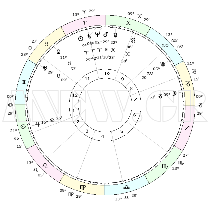 | | ΘΕΣΕΙΣ ΠΛΑΝΗΤΩΝ ΑΣΤΡΟΛΟΓΙΚΟΥ ΧΑΡΤΗ ΤΗΣ ΣΤΙΓΜΗΣ ΑΥΤΗΣ | | | | Πλανήτης | Ζώδιο | Μοίρες | Δεκαήμ. | Σε οίκο | Απόκλιση | | Ακμές των οίκων | | Ηλιος | Κριός | 19°25' | Δεύτερο | 11 | 07 N 36 | | 1ος | 06°05' | Δίδυμοι | | Σελήνη | Αιγόκερως | 09°05' | Πρώτο | 8 | 27 S 33 | | 2ος | 29°44' | Δίδυμοι | | Ερμής | Ιχθείς | 22°18' | Τρίτο | 11 | 05 S 09 | | 3ος | 20°60' | Καρκίνος | | Αφροδίτη | Ταύρος | 11°48' | Δεύτερο | 12 | 15 N 17 | | 4ος | 14°16' | Λέων | | Αρης | Ιχθείς | 29°35' | Τρίτο | 11 | 01 S 06 | | 5ος | 13°49' | Παρθένος | | Δίας | Καρκίνος | 16°25' | Δεύτερο | 2 | 22 N 48 | | 6ος | 23°07' | Ζυγός | | Κρόνος | Κριός | 06°41' | Πρώτο | 11 | 00 N 41 | | 7ος | 06°05' | Τοξότης | | Ουρανός | Ταύρος | 29°09' | Τρίτο | 12 | 19 N 48 | | 8ος | 29°44' | Τοξότης | | Ποσειδώνας | Κριός | 02°31' | Πρώτο | 11 | 00 S 12 | | 9ος | 20°60' | Αιγόκερως | | Πλούτωνας | Υδροχόος | 05°20' | Πρώτο | 9 | 22 S 47 | | 10ος | 14°16' | Υδροχόος | | Β. Δεσμός | Ιχθείς | 06°58' | Πρώτο | 10 | 08 S 57 | | 11ος | 13°49' | Ιχθείς | | Ωροσκόπος | Δίδυμοι | 06°05' | Πρώτο | | | 12ος | 23°07' | Κριός | | Μεσουράνημα | Υδροχόος | 14°16' | Δεύτερο | | | |