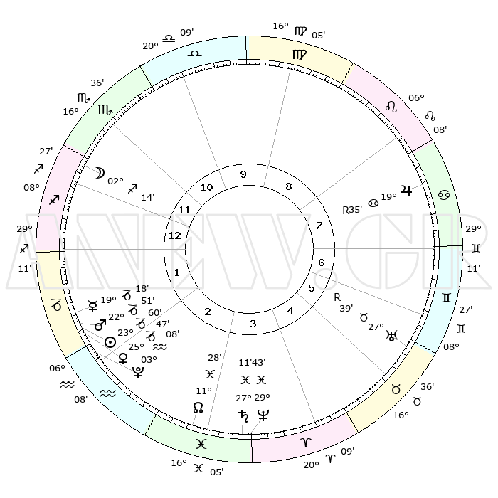 | | ΘΕΣΕΙΣ ΠΛΑΝΗΤΩΝ ΑΣΤΡΟΛΟΓΙΚΟΥ ΧΑΡΤΗ ΤΗΣ ΣΤΙΓΜΗΣ ΑΥΤΗΣ | | | | Πλανήτης | Ζώδιο | Μοίρες | Δεκαήμ. | Σε οίκο | Απόκλιση | | Ακμές των οίκων | | Ηλιος | Αιγόκερως | 23°51' | Τρίτο | 3 | 21 S 20 | | 1ος | 15°07' | Σκορπιός | | Σελήνη | Τοξότης | 00°30' | Πρώτο | 1 | 25 S 11 | | 2ος | 14°36' | Τοξότης | | Ερμής | Αιγόκερως | 19°04' | Δεύτερο | 3 | 23 S 47 | | 3ος | 18°06' | Αιγόκερως | | Αφροδίτη | Αιγόκερως | 25°36' | Τρίτο | 3 | 21 S 57 | | 4ος | 23°23' | Υδροχόος | | Αρης | Αιγόκερως | 22°44' | Τρίτο | 3 | 22 S 28 | | 5ος | 25°48' | Ιχθείς | | Δίας | Καρκίνος | 19°37'R | Δεύτερο | 9 | 22 N 16 | | 6ος | 22°49' | Κριός | | Κρόνος | Ιχθείς | 27°10' | Τρίτο | 5 | 03 S 10 | | 7ος | 15°07' | Ταύρος | | Ουρανός | Ταύρος | 27°39'R | Τρίτο | 7 | 19 N 26 | | 8ος | 14°36' | Δίδυμοι | | Ποσειδώνας | Ιχθείς | 29°43' | Τρίτο | 5 | 01 S 20 | | 9ος | 18°06' | Καρκίνος | | Πλούτωνας | Υδροχόος | 03°08' | Πρώτο | 3 | 23 S 08 | | 10ος | 23°23' | Λέων | | Β. Δεσμός | Ιχθείς | 11°29' | Δεύτερο | 4 | 07 S 15 | | 11ος | 25°48' | Παρθένος | | Ωροσκόπος | Σκορπιός | 15°07' | Δεύτερο | | | 12ος | 22°49' | Ζυγός | | Μεσουράνημα | Λέων | 23°23' | Τρίτο | | | |