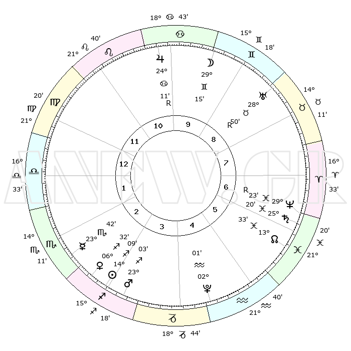 | | ΘΕΣΕΙΣ ΠΛΑΝΗΤΩΝ ΑΣΤΡΟΛΟΓΙΚΟΥ ΧΑΡΤΗ ΤΗΣ ΣΤΙΓΜΗΣ ΑΥΤΗΣ | | | | Πλανήτης | Ζώδιο | Μοίρες | Δεκαήμ. | Σε οίκο | Απόκλιση | | Ακμές των οίκων | | Ηλιος | Τοξότης | 14°07' | Δεύτερο | 3 | 22 S 29 | | 1ος | 06°44' | Ζυγός | | Σελήνη | Δίδυμοι | 28°45' | Τρίτο | 9 | 28 N 15 | | 2ος | 03°47' | Σκορπιός | | Ερμής | Σκορπιός | 23°40' | Τρίτο | 2 | 16 S 17 | | 3ος | 04°29' | Τοξότης | | Αφροδίτη | Τοξότης | 06°30' | Πρώτο | 3 | 20 S 53 | | 4ος | 07°34' | Αιγόκερως | | Αρης | Τοξότης | 23°01' | Τρίτο | 3 | 23 S 57 | | 5ος | 10°30' | Υδροχόος | | Δίας | Καρκίνος | 24°11'R | Τρίτο | 10 | 21 N 26 | | 6ος | 10°40' | Ιχθείς | | Κρόνος | Ιχθείς | 25°20' | Τρίτο | 6 | 04 S 01 | | 7ος | 06°44' | Κριός | | Ουρανός | Ταύρος | 28°51'R | Τρίτο | 8 | 19 N 42 | | 8ος | 03°47' | Ταύρος | | Ποσειδώνας | Ιχθείς | 29°23'R | Τρίτο | 6 | 01 S 29 | | 9ος | 04°29' | Δίδυμοι | | Πλούτωνας | Υδροχόος | 02°01' | Πρώτο | 4 | 23 S 22 | | 10ος | 07°34' | Καρκίνος | | Β. Δεσμός | Ιχθείς | 13°33' | Δεύτερο | 6 | 06 S 28 | | 11ος | 10°30' | Λέων | | Ωροσκόπος | Ζυγός | 06°44' | Πρώτο | | | 12ος | 10°40' | Παρθένος | | Μεσουράνημα | Καρκίνος | 07°34' | Πρώτο | | | |