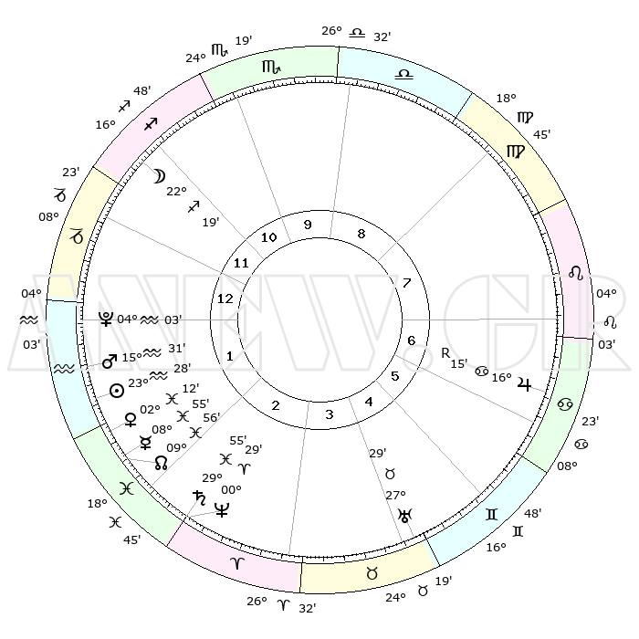 | | ΘΕΣΕΙΣ ΠΛΑΝΗΤΩΝ ΑΣΤΡΟΛΟΓΙΚΟΥ ΧΑΡΤΗ ΤΗΣ ΣΤΙΓΜΗΣ ΑΥΤΗΣ | | | | Πλανήτης | Ζώδιο | Μοίρες | Δεκαήμ. | Σε οίκο | Απόκλιση | | Ακμές των οίκων | | Ηλιος | Υδροχόος | 23°24' | Τρίτο | 2 | 13 S 43 | | 1ος | 11°23' | Αιγόκερως | | Σελήνη | Τοξότης | 21°38' | Τρίτο | 12 | 28 S 18 | | 2ος | 21°27' | Υδροχόος | | Ερμής | Ιχθείς | 08°50' | Πρώτο | 2 | 08 S 45 | | 3ος | 01°43' | Κριός | | Αφροδίτη | Ιχθείς | 02°08' | Πρώτο | 2 | 12 S 05 | | 4ος | 03°38' | Ταύρος | | Αρης | Υδροχόος | 15°28' | Δεύτερο | 1 | 17 S 13 | | 5ος | 28°17' | Ταύρος | | Δίας | Καρκίνος | 16°15'R | Δεύτερο | 7 | 22 N 46 | | 6ος | 19°35' | Δίδυμοι | | Κρόνος | Ιχθείς | 29°55' | Τρίτο | 2 | 02 S 01 | | 7ος | 11°23' | Καρκίνος | | Ουρανός | Ταύρος | 27°29' | Τρίτο | 4 | 19 N 25 | | 8ος | 21°27' | Λέων | | Ποσειδώνας | Κριός | 00°29' | Πρώτο | 2 | 01 S 01 | | 9ος | 01°43' | Ζυγός | | Πλούτωνας | Υδροχόος | 04°03' | Πρώτο | 1 | 22 S 57 | | 10ος | 03°38' | Σκορπιός | | Β. Δεσμός | Ιχθείς | 09°56' | Πρώτο | 2 | 07 S 50 | | 11ος | 28°17' | Σκορπιός | | Ωροσκόπος | Αιγόκερως | 11°23' | Δεύτερο | | | 12ος | 19°35' | Τοξότης | | Μεσουράνημα | Σκορπιός | 03°38' | Πρώτο | | | |