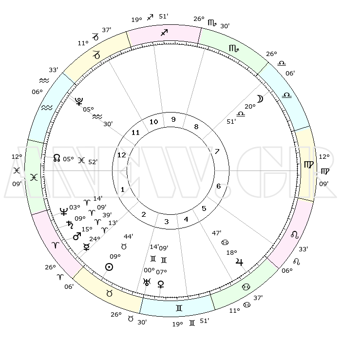| | ΘΕΣΕΙΣ ΠΛΑΝΗΤΩΝ ΑΣΤΡΟΛΟΓΙΚΟΥ ΧΑΡΤΗ ΤΗΣ ΣΤΙΓΜΗΣ ΑΥΤΗΣ | | | | Πλανήτης | Ζώδιο | Μοίρες | Δεκαήμ. | Σε οίκο | Απόκλιση | | Ακμές των οίκων | | Ηλιος | Ταύρος | 09°41' | Πρώτο | 3 | 14 N 43 | | 1ος | 16°14' | Υδροχόος | | Σελήνη | Ζυγός | 20°15' | Τρίτο | 8 | 11 S 07 | | 2ος | 01°59' | Κριός | | Ερμής | Κριός | 24°08' | Τρίτο | 2 | 07 N 28 | | 3ος | 07°27' | Ταύρος | | Αφροδίτη | Δίδυμοι | 07°05' | Πρώτο | 4 | 22 N 20 | | 4ος | 03°26' | Δίδυμοι | | Αρης | Κριός | 15°37' | Δεύτερο | 2 | 05 N 19 | | 5ος | 25°22' | Δίδυμοι | | Δίας | Καρκίνος | 18°47' | Δεύτερο | 6 | 22 N 30 | | 6ος | 17°41' | Καρκίνος | | Κρόνος | Κριός | 09°09' | Πρώτο | 2 | 01 N 38 | | 7ος | 16°14' | Λέων | | Ουρανός | Δίδυμοι | 00°13' | Πρώτο | 3 | 20 N 02 | | 8ος | 01°59' | Ζυγός | | Ποσειδώνας | Κριός | 03°14' | Πρώτο | 2 | 00 N 04 | | 9ος | 07°27' | Σκορπιός | | Πλούτωνας | Υδροχόος | 05°30' | Πρώτο | 12 | 22 S 49 | | 10ος | 03°26' | Τοξότης | | Β. Δεσμός | Ιχθείς | 05°52' | Πρώτο | 1 | 09 S 21 | | 11ος | 25°22' | Τοξότης | | Ωροσκόπος | Υδροχόος | 16°14' | Δεύτερο | | | 12ος | 17°41' | Αιγόκερως | | Μεσουράνημα | Τοξότης | 03°26' | Πρώτο | | | |