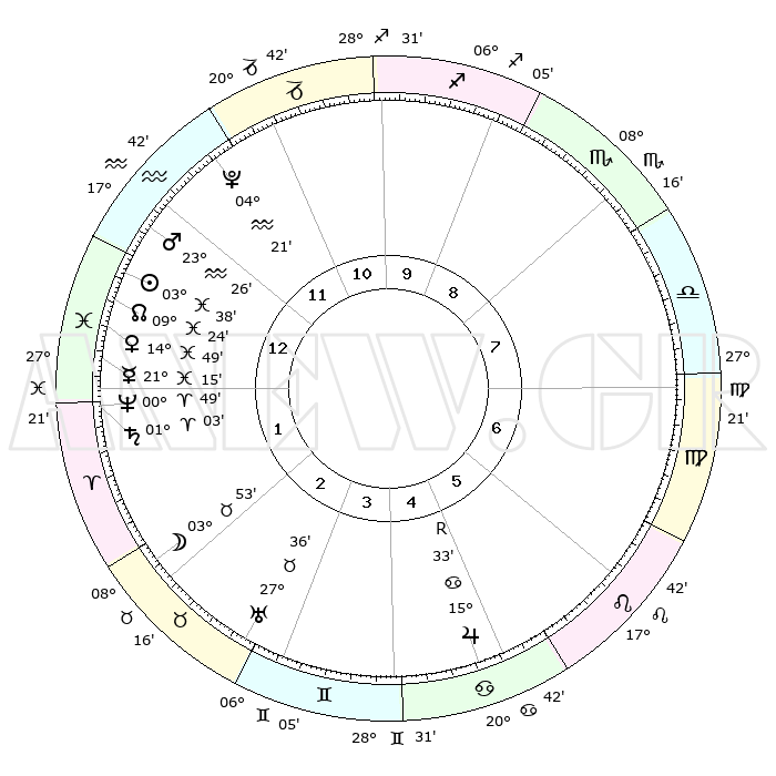 | | ΘΕΣΕΙΣ ΠΛΑΝΗΤΩΝ ΑΣΤΡΟΛΟΓΙΚΟΥ ΧΑΡΤΗ ΤΗΣ ΣΤΙΓΜΗΣ ΑΥΤΗΣ | | | | Πλανήτης | Ζώδιο | Μοίρες | Δεκαήμ. | Σε οίκο | Απόκλιση | | Ακμές των οίκων | | Ηλιος | Ιχθείς | 03°33' | Πρώτο | 1 | 10 S 12 | | 1ος | 16°05' | Υδροχόος | | Σελήνη | Ταύρος | 02°50' | Πρώτο | 2 | 16 N 28 | | 2ος | 01°50' | Κριός | | Ερμής | Ιχθείς | 21°12' | Τρίτο | 1 | 01 S 50 | | 3ος | 07°20' | Ταύρος | | Αφροδίτη | Ιχθείς | 14°43' | Δεύτερο | 1 | 07 S 21 | | 4ος | 03°20' | Δίδυμοι | | Αρης | Υδροχόος | 23°23' | Τρίτο | 1 | 14 S 45 | | 5ος | 25°16' | Δίδυμοι | | Δίας | Καρκίνος | 15°33'R | Δεύτερο | 5 | 22 N 52 | | 6ος | 17°35' | Καρκίνος | | Κρόνος | Κριός | 01°02' | Πρώτο | 1 | 01 S 33 | | 7ος | 16°05' | Λέων | | Ουρανός | Ταύρος | 27°36' | Τρίτο | 3 | 19 N 27 | | 8ος | 01°50' | Ζυγός | | Ποσειδώνας | Κριός | 00°49' | Πρώτο | 1 | 00 S 53 | | 9ος | 07°20' | Σκορπιός | | Πλούτωνας | Υδροχόος | 04°21' | Πρώτο | 12 | 22 S 54 | | 10ος | 03°20' | Τοξότης | | Β. Δεσμός | Ιχθείς | 09°24' | Πρώτο | 1 | 08 S 02 | | 11ος | 25°16' | Τοξότης | | Ωροσκόπος | Υδροχόος | 16°05' | Δεύτερο | | | 12ος | 17°35' | Αιγόκερως | | Μεσουράνημα | Τοξότης | 03°20' | Πρώτο | | | |