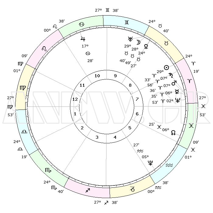 | | ΘΕΣΕΙΣ ΠΛΑΝΗΤΩΝ ΑΣΤΡΟΛΟΓΙΚΟΥ ΧΑΡΤΗ ΤΗΣ ΣΤΙΓΜΗΣ ΑΥΤΗΣ | | | | Πλανήτης | Ζώδιο | Μοίρες | Δεκαήμ. | Σε οίκο | Απόκλιση | | Ακμές των οίκων | | Ηλιος | Κριός | 29°29' | Τρίτο | 8 | 11 N 17 | | 1ος | 08°17' | Παρθένος | | Σελήνη | Ταύρος | 27°49' | Τρίτο | 9 | 24 N 34 | | 2ος | 02°59' | Ζυγός | | Ερμής | Κριός | 06°29' | Πρώτο | 8 | 00 N 09 | | 3ος | 02°19' | Σκορπιός | | Αφροδίτη | Ταύρος | 24°22' | Τρίτο | 9 | 19 N 14 | | 4ος | 05°16' | Τοξότης | | Αρης | Κριός | 07°33' | Πρώτο | 8 | 02 N 07 | | 5ος | 08°57' | Αιγόκερως | | Δίας | Καρκίνος | 17°28' | Δεύτερο | 11 | 22 N 40 | | 6ος | 10°21' | Υδροχόος | | Κρόνος | Κριός | 07°56' | Πρώτο | 8 | 01 N 10 | | 7ος | 08°17' | Ιχθείς | | Ουρανός | Ταύρος | 29°39' | Τρίτο | 9 | 19 N 55 | | 8ος | 02°59' | Κριός | | Ποσειδώνας | Κριός | 02°53' | Πρώτο | 7 | 00 S 04 | | 9ος | 02°19' | Ταύρος | | Πλούτωνας | Υδροχόος | 05°26' | Πρώτο | 5 | 22 S 48 | | 10ος | 05°16' | Δίδυμοι | | Β. Δεσμός | Ιχθείς | 06°25' | Πρώτο | 6 | 09 S 09 | | 11ος | 08°57' | Καρκίνος | | Ωροσκόπος | Παρθένος | 08°17' | Πρώτο | | | 12ος | 10°21' | Λέων | | Μεσουράνημα | Δίδυμοι | 05°16' | Πρώτο | | | |